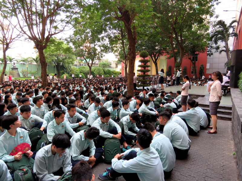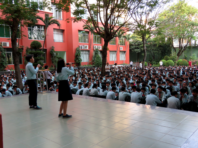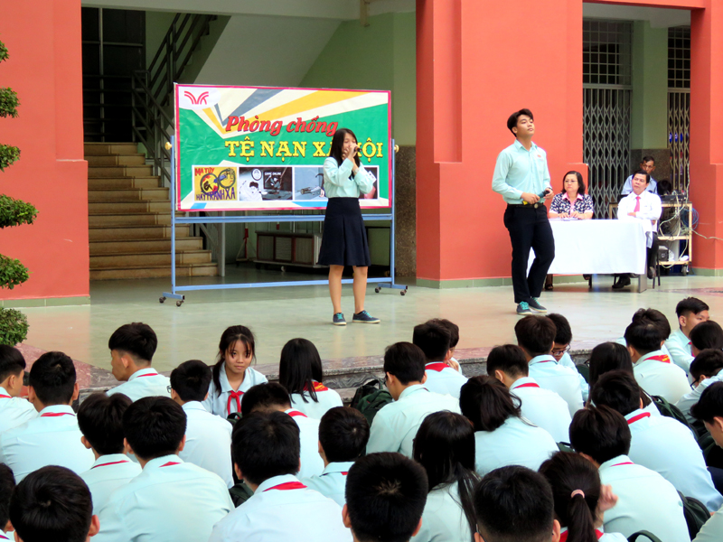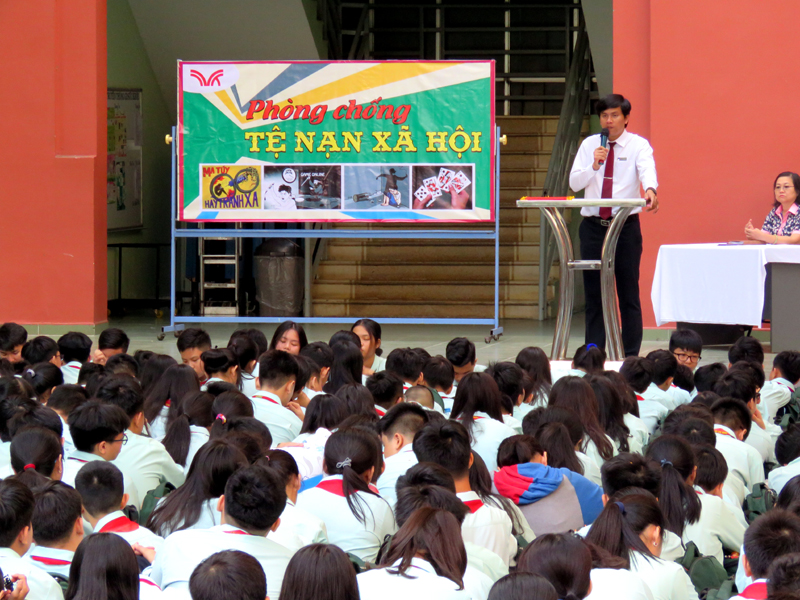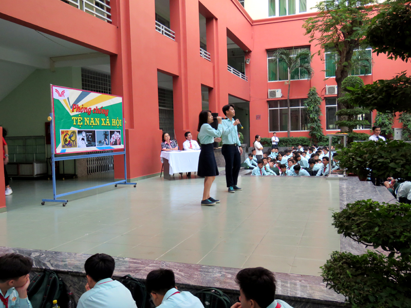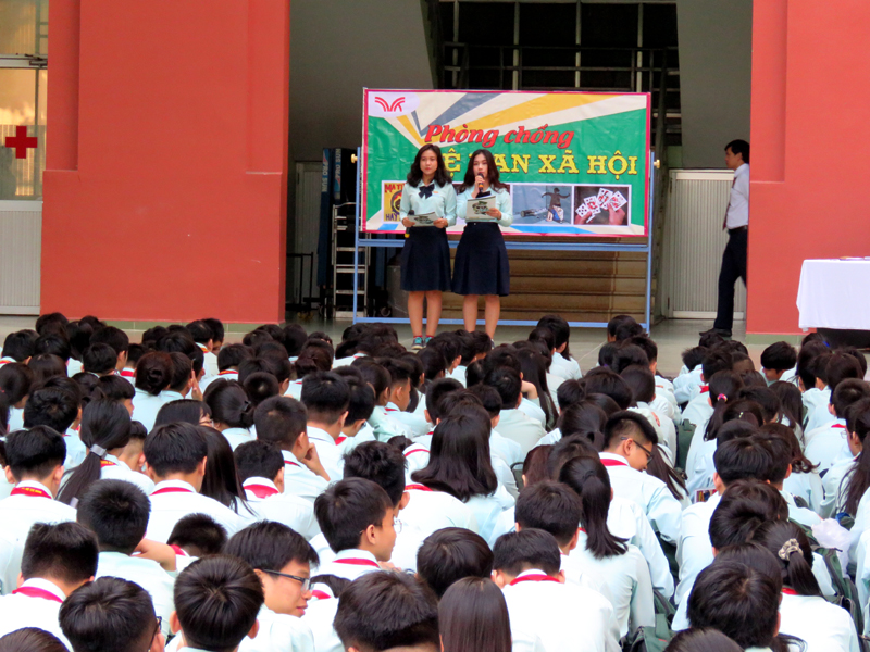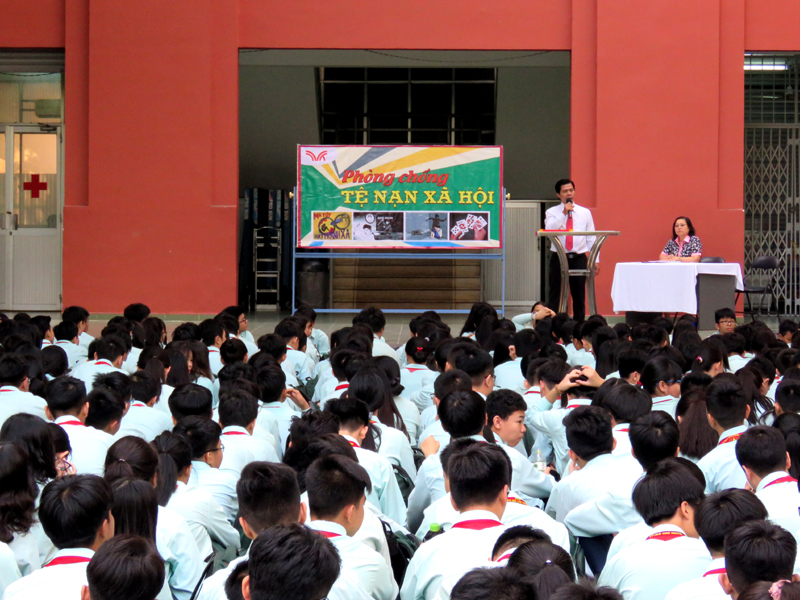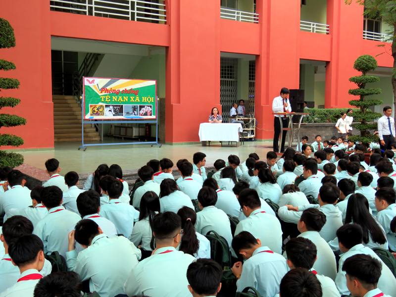 Vào lúc 7g00, thứ hai ngày 18/03/2019 tại cơ sở TĐT. BLĐ nhà trường đã chỉ đạo thực hiện chương trình Ngoài giờ lên lớp với chủ đề "PHÒNG CHỐNG TỆ NẠN XÃ HỘI". Buổi sinh hoạt là phần thuyết trình về các tệ nạn xã hội và các tiết mục văn nghệ được thực hiện bởi lớp 11A12 và 11A20.