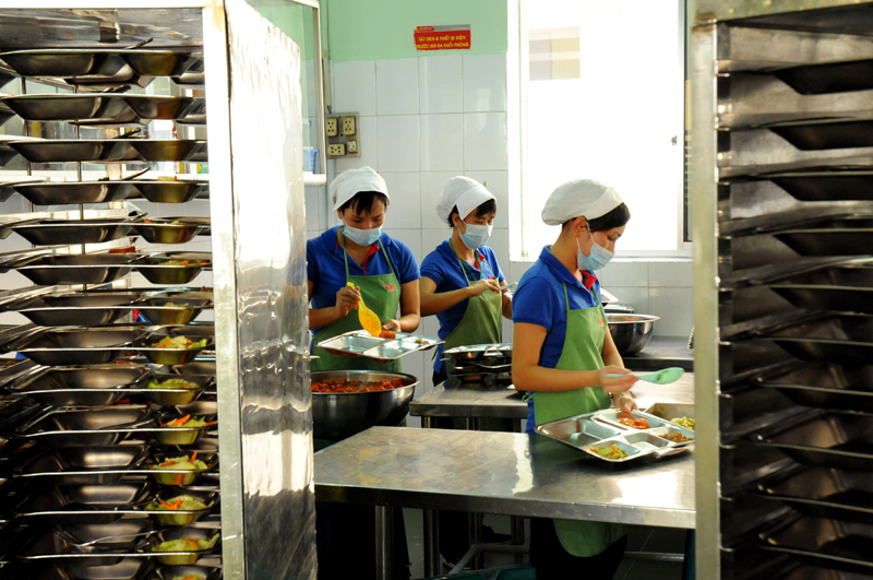 Đối với bộ phận nhà ăn, nhân viên thực hiện nghiêm ngặt quy định về an toàn vệ sinh thực phẩm như nắm vững nguồn gốc thực phẩm, bảo lưu mẫu thức ăn trong ngày, đảm bảo chất lượng khẩu phần ăn cho học sinh.