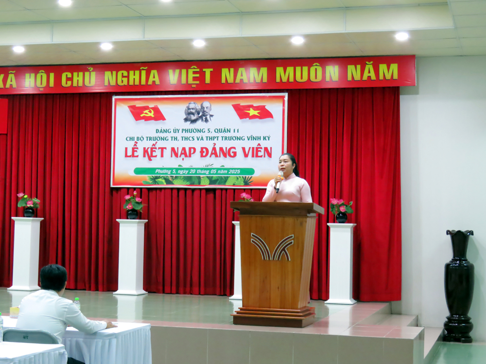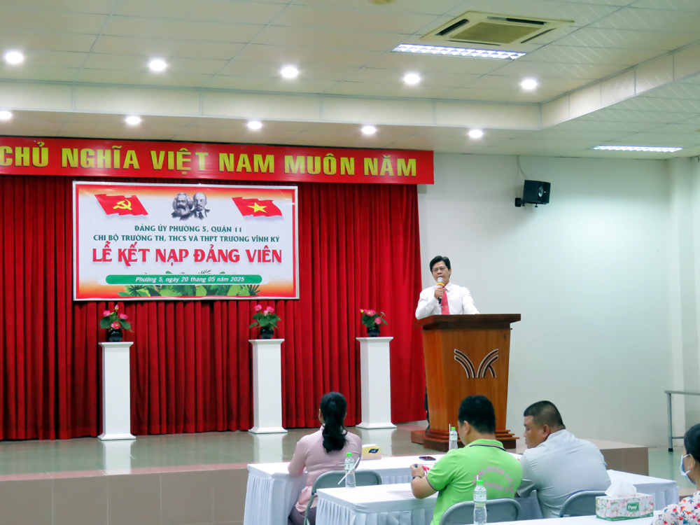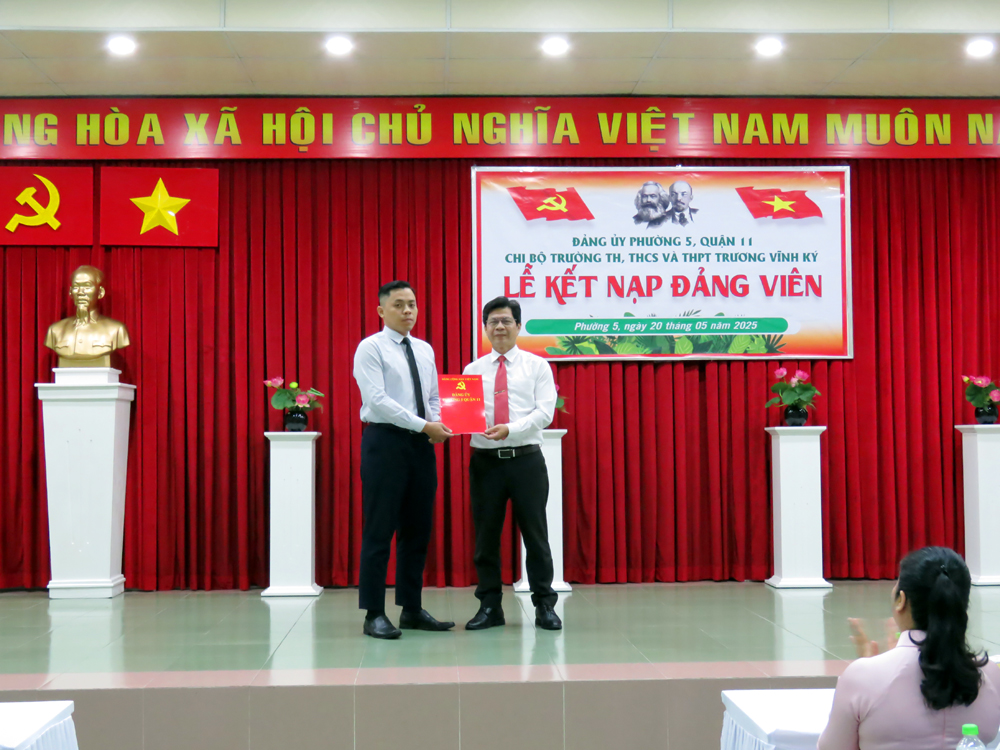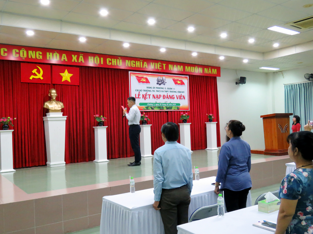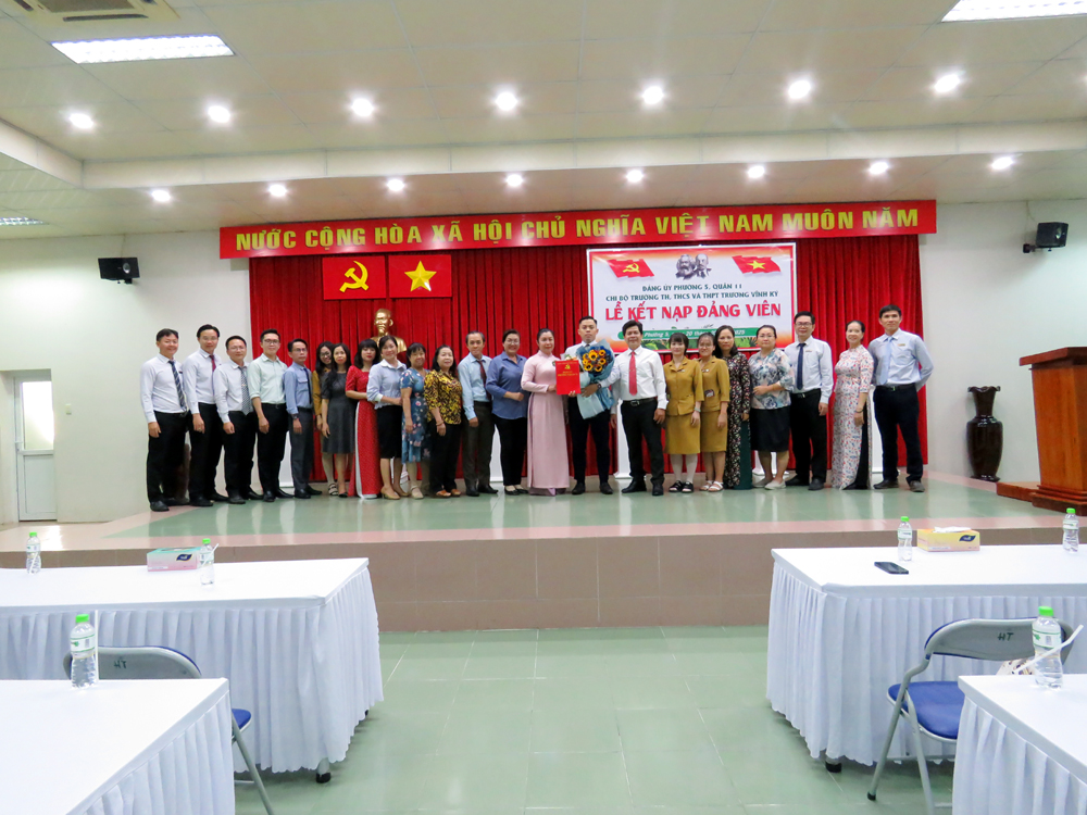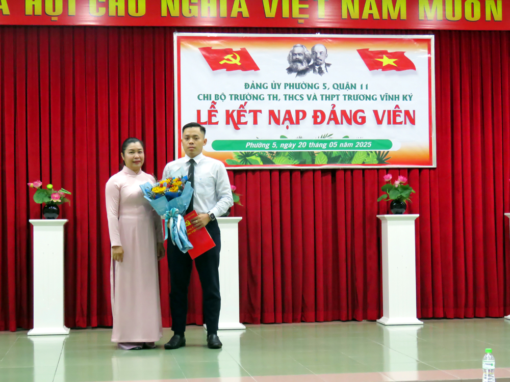 Căn cứ Điểm 3, Điều 24, Điều lệ Đảng Cộng sản Việt Nam quy định về đại hội chi bộ trực thuộc đảng ủy cơ sở; Quy định số 29-QĐ/TW ngày 25/7/2016 của Ban Chấp hành Trung ương về thi hành Điều lệ Đảng và Hướng dẫn số 01-HD/TW ngày 20/9/2016 của Ban Bí thư về “Một số vấn đề cụ thể thi hành Điều lệ Đảng”; thực hiện Kế hoạch số 37-KH/ĐU… vào lúc 16g00 ngày thứ bảy 20/05/2025 tại cơ sở Trịnh Đình Trọng của nhà trường, Chi bộ Trường TiH, THCS và THPT Trương Vĩnh Ký đã tổ chức Lễ kết nạp Đảng cho thầy Lê Hữu Tình - Giáo viên chủ nhiệm đã hoàn thành xuất sắc nhiệm vụ nhiều năm liền.