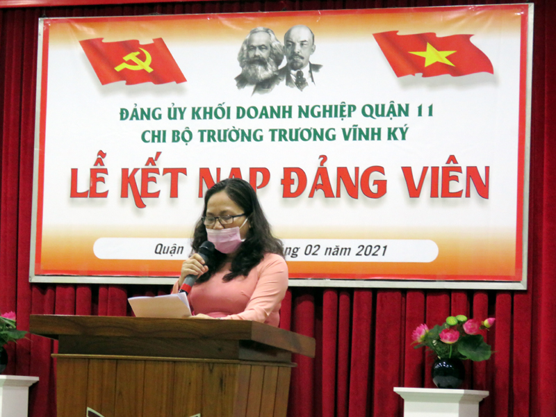 Căn cứ Điểm 3, Điều 24, Điều lệ Đảng Cộng sản Việt Nam quy định về đại hội chi bộ trực thuộc đảng ủy cơ sở; Quy định số 29-QĐ/TW ngày 25/7/2016 của Ban Chấp hành Trung ương về thi hành Điều lệ Đảng và Hướng dẫn số 01-HD/TW ngày 20/9/2016 của Ban Bí thư về “Một số vấn đề cụ thể thi hành Điều lệ Đảng”; thực hiện Kế hoạch số 37-KH/ĐU… vào lúc 17g00 ngày thứ bảy 02/02/2021 tại cơ sở Trịnh Đình Trọng của nhà trường, Chi bộ Trường TiH, THCS và THPT Trương Vĩnh Ký đã tổ chức Lễ kết nạp Đảng cho cô Nguyễn Thị Mỹ Hạnh là Giáo viên Toán đã hoàn thành xuất sắc nhiệm vụ nhiều năm liền.