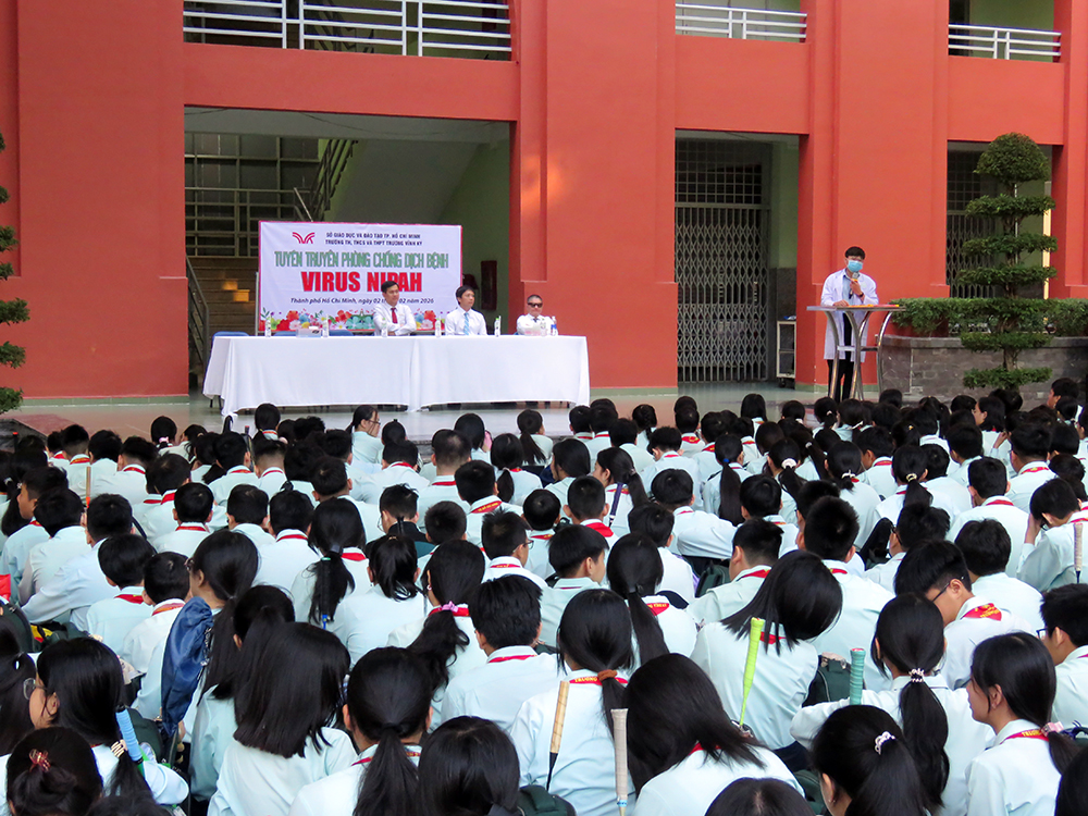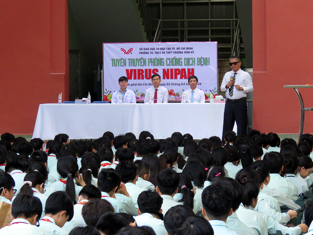 Virus Nipah là gì và có thể lây truyền như thế nào? Nhận biết những dấu hiệu bất thường của cơ thể - Những triệu chứng cần lưu ý và quan trọng nhất là biết cách phòng bệnh đúng cách, khoa học, không hoang mang nhưng cũng không chủ quan trước diễn biến của virus Nipah; các khuyến cáo phòng, chống bệnh theo hướng dẫn của ngành y tế… là nội dung của buổi tuyên truyền, phòng chống dịch bệnh do virus Nipah gây ra - được tổ chức trong giờ Chào cờ, sáng thứ Hai, ngày 02 tháng 02 năm 2026 tại trường TH, THCS và THPT Trương Vĩnh Ký.