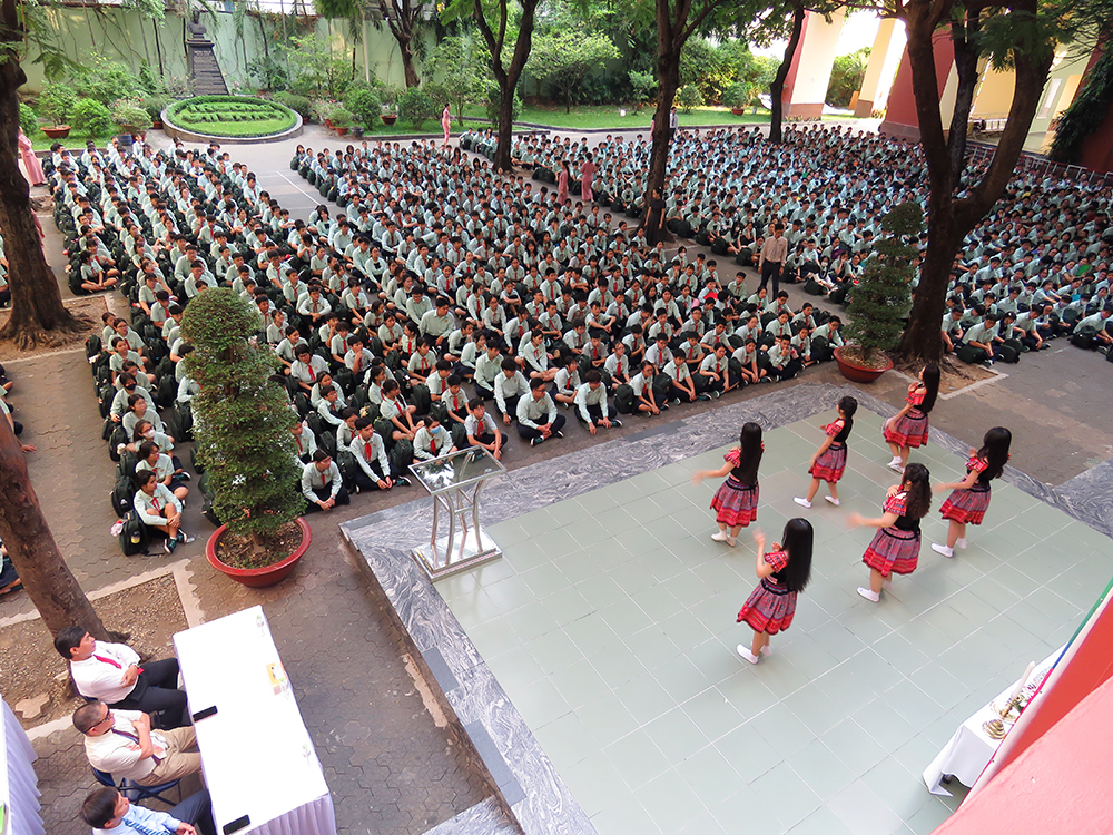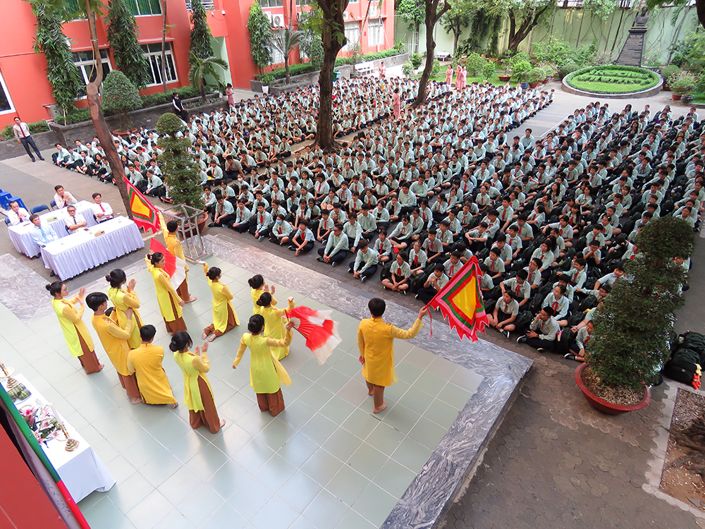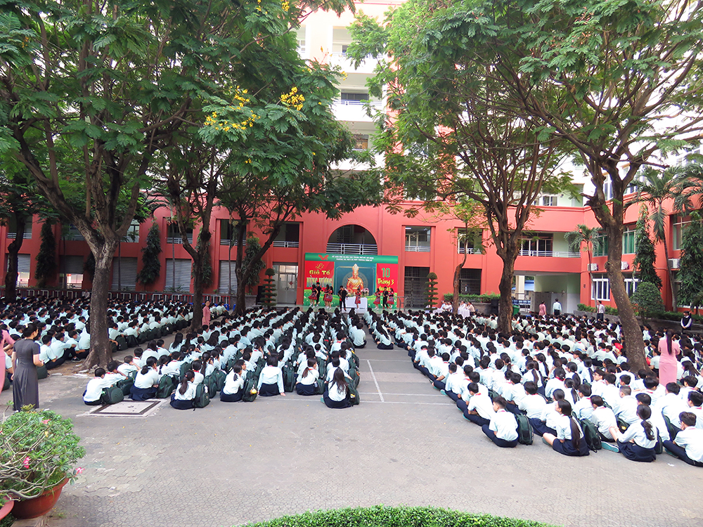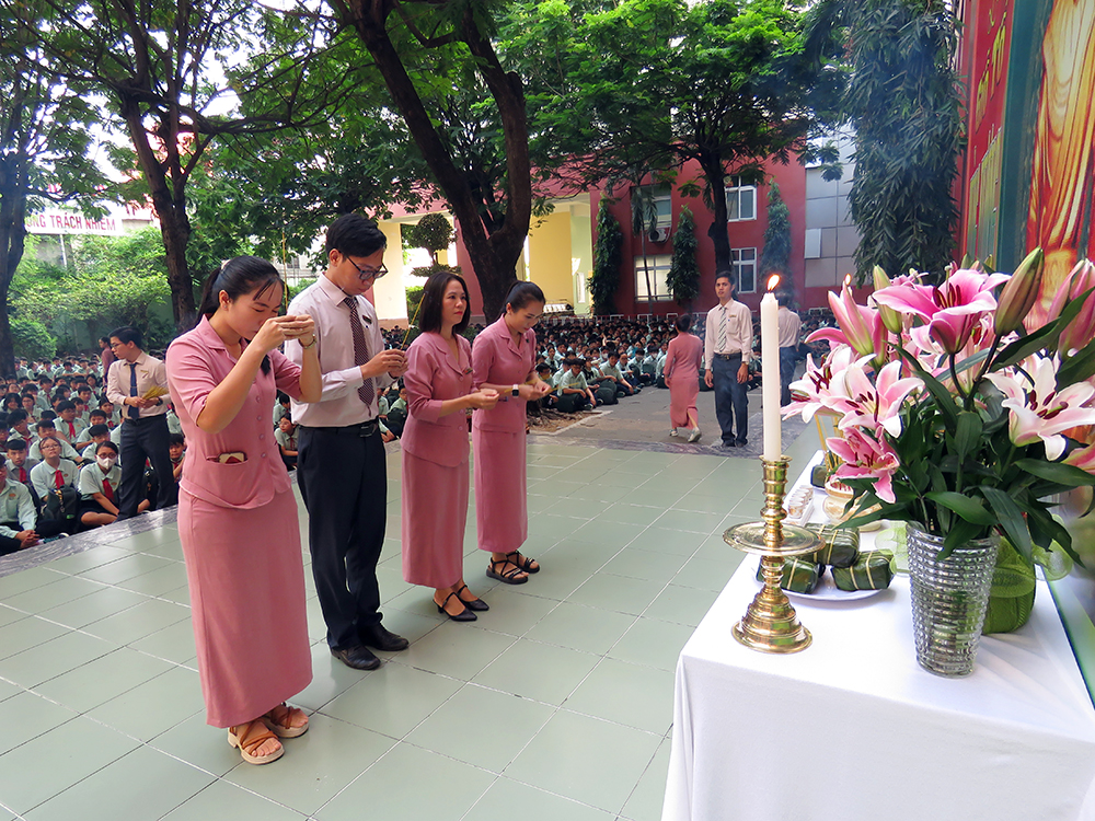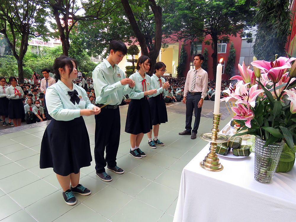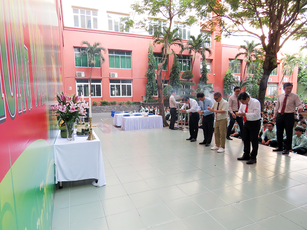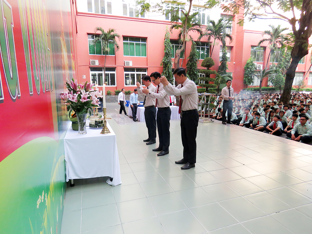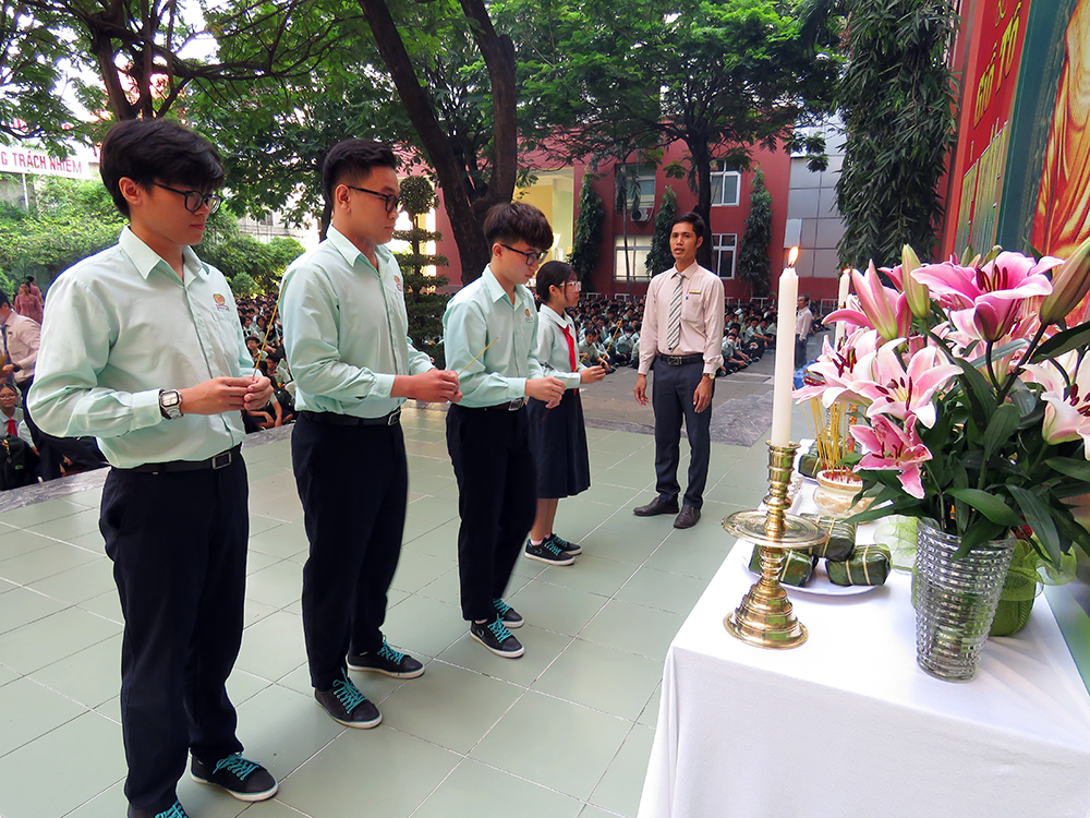 Đầu chương trình, là các tiết mục văn nghệ, tiếp đến Ban Lãnh đạo, các thầy cô chủ nhiệm và các em dâng hương tưởng niệm.