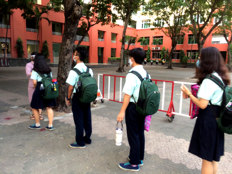 Các em xếp hàng giản cách theo quy định và được kiểm tra thân nhiệt, rửa tay diệt khuẩn trước khi vào trường