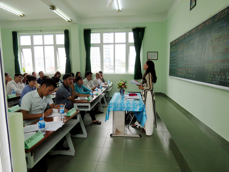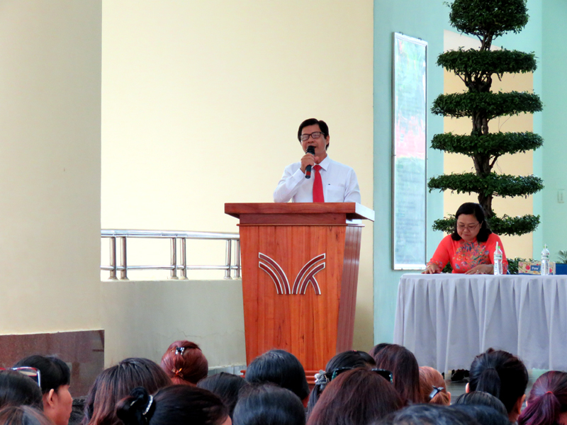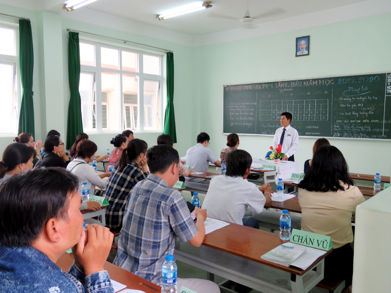 Thầy Hiệu trưởng Báo cáo tóm tắt kết quả năm học 2018 - 2019 và nêu ra Phương hướng hoạt động của năm học mới 2019 – 2020