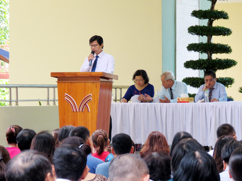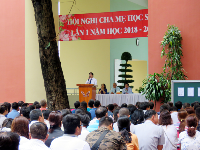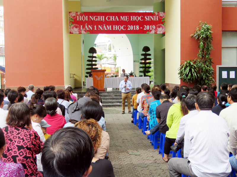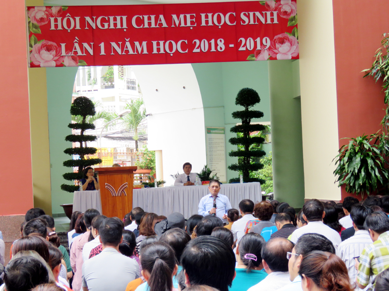 Trong buổi họp, BLĐ nhà trường tổng kết hoạt động năm học 2017 – 2018, thông tin đến quý CMHS lịch sinh hoạt nhà trường đầu năm học và kế hoạch học tập cho năm học mới 2018-2019.