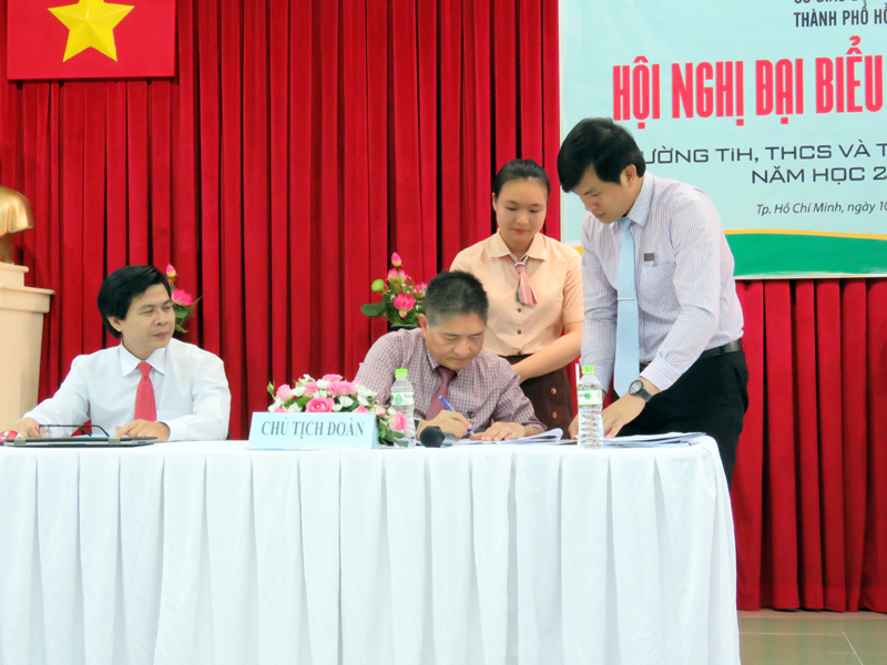 Sau hơn 2 giờ làm việc, thỏa ước lao động tập thể và Nghị quyết Hội nghị đại biều Người lao động đã được ký kết giữa đại diện người sử dụng lao động và đại diện người lao động: Thầy Trần Văn Hiếu và thầy Vũ Văn Tĩnh – Chủ tịch Công đoàn cơ sở nhà trường.