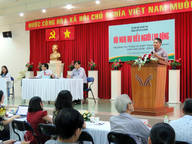 Chủ tịch Công đoàn Giáo dục Thành phố Hồ Chí Minh phát biểu tại Hội nghị