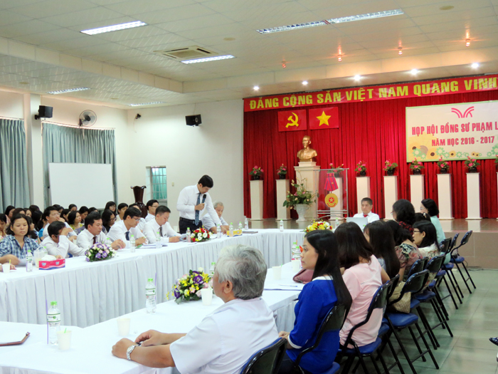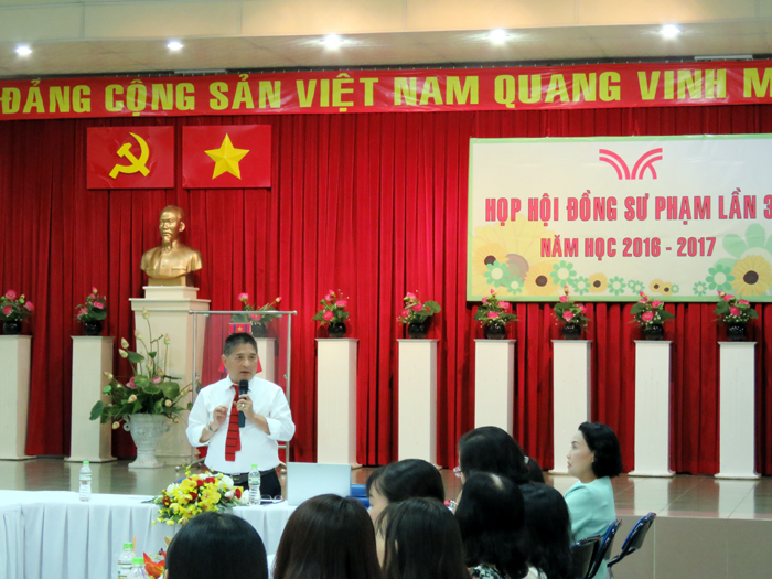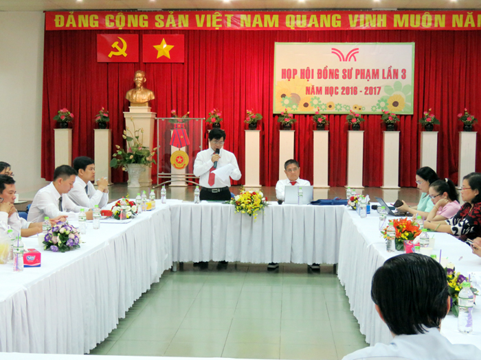 Trong buổi họp, thầy Hiệu trưởng nhà trường đã tổng kết hoạt động chuyên môn trong năm 2016 – 2017 và đề ra phương hướng nhiệm vụ trong năm học mới 2017 – 2018 đồng thời nhắc nhở góp ý những thầy cô làm việc chưa đạt hiệu quả, biều dương những thầy cô đạt kết quả tốt trong công tác giảng dạy…