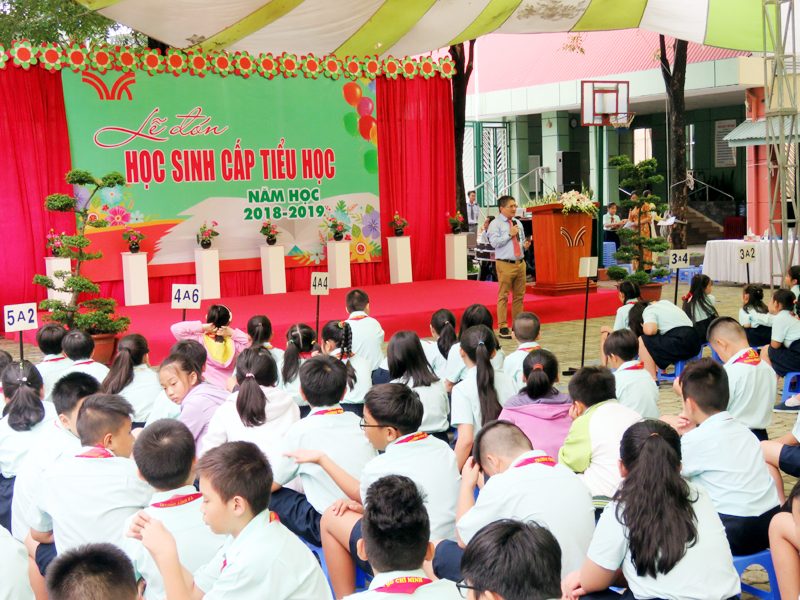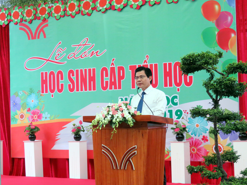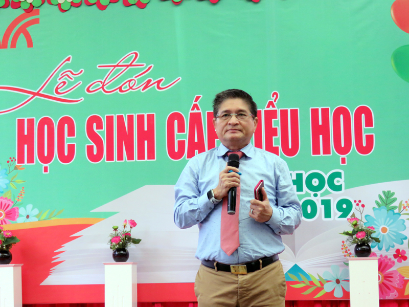 Thầy Phan Văn Thanh - Hiệu trưởng nhà trường đọc diễn văn chào đón các em học sinh cấp Tiểu học.