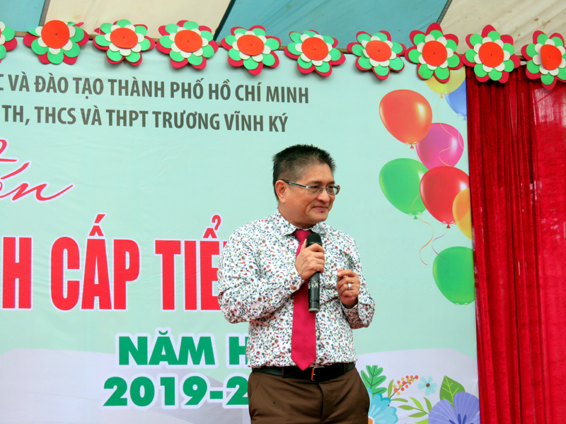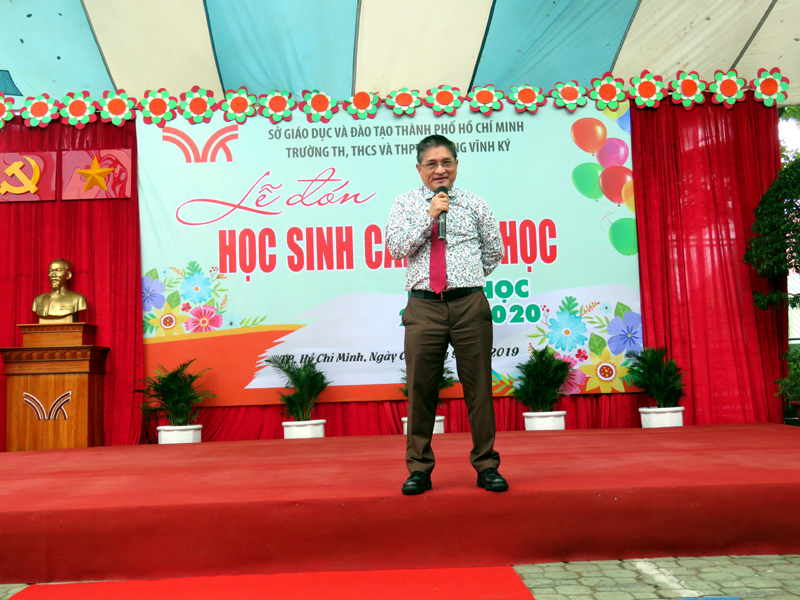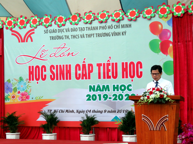Thầy Hiệu trưởng Phan Văn Thanh phát biều chào mừng các em lớp 1 và toàn thể học sinh cấp tiểu học.