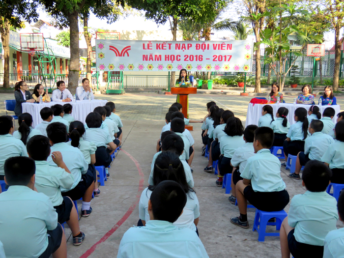 Trong buổi Lễ, cô Nguyễn Thị Châu Lư - Tổng phụ trách đọc quyết định kết nạp, sau đó Nghi thức trao khăn quàng cho học sinh và các Đội viên mới đọc lời hứa Đội viên.