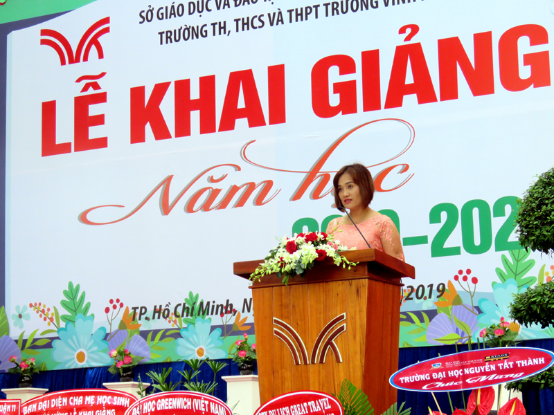 Bà Hồ Diễm Mai - Phó Ban Đại diện CMHS toàn trường phát biểu chào mừng năm học mới.