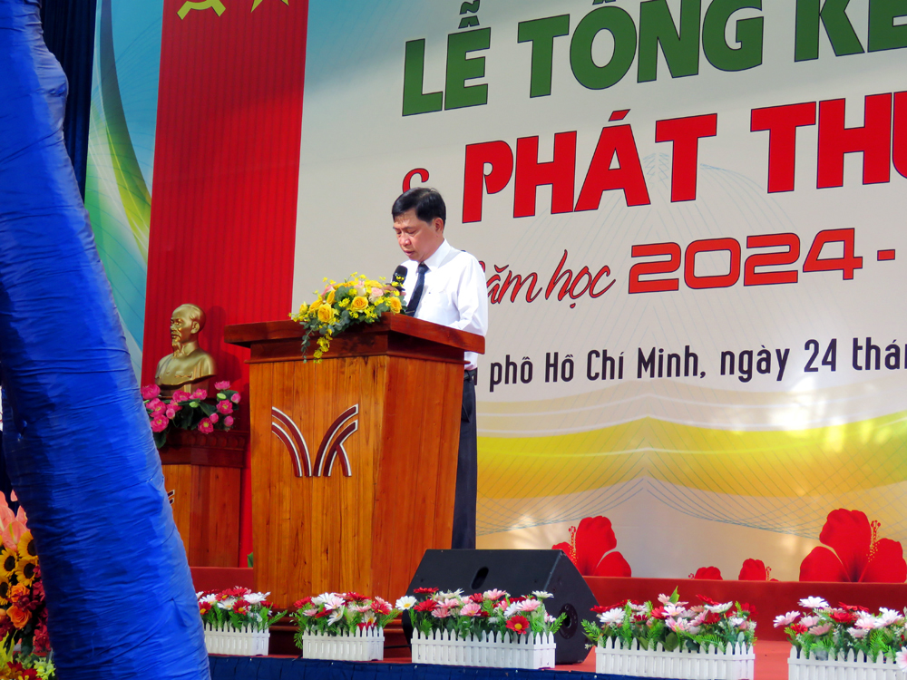 Thầy Hiệu trưởng Phan Văn Thanh báo cáo tóm tắt các hoạt động, thành tích của nhà trường năm học 2024 - 2025