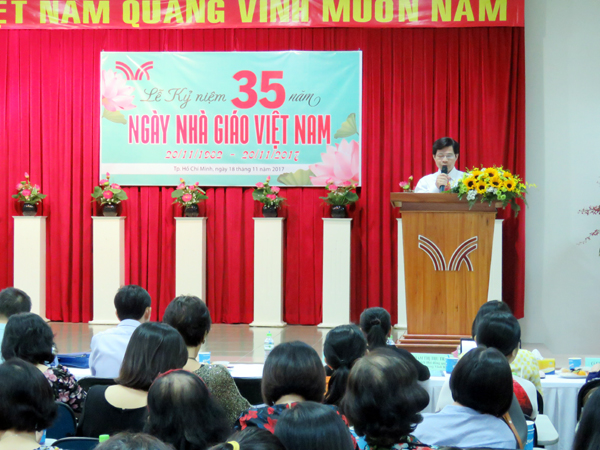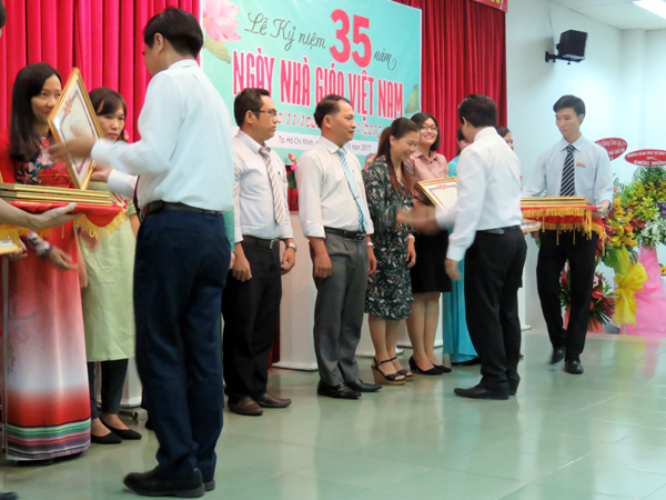 Tham dự có các vị khách quý là đại diện UBND quận, Sở GD-ĐT, Phòng GD-ĐT, Đại diện các trường đại học và Ban Đại diện CMHS … Mở đầu buổi Lễ, thầy Trần Văn Hiếu – Chủ tịch HĐQT nhà trường chúc mừng các thầy cô giáo Tiếp đến, thầy Đặng Đức Hoàng, Quận ủy viên, Trưởng phòng Giáo dục và Đào tạo Quận 11 cũng đã phát biều chúc mừng tập thể Hội đồng sư phạm nhà trường cũng như biều dương những thầy cô giáo đã hoàn thành tốt nhiệm vụ trong thời gian qua. Ngoài phần phát biều chúc mừng của lãnh đạo các cấp là phần khen thưởng Chiến sĩ thi năm học 2016 – 2017.