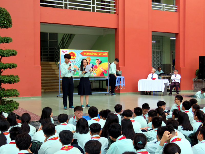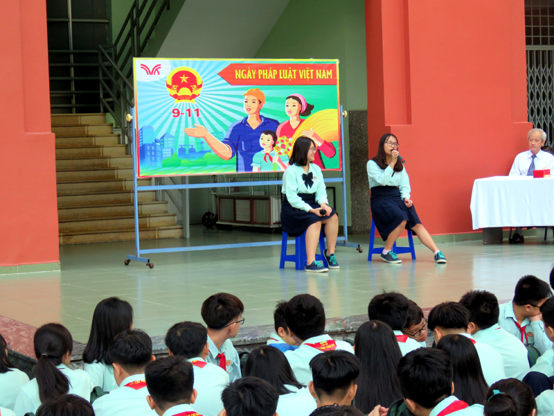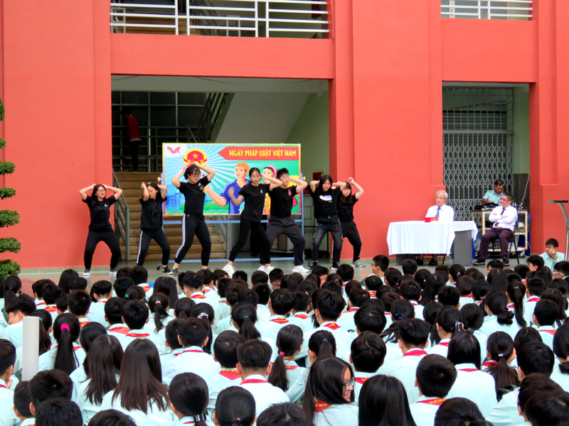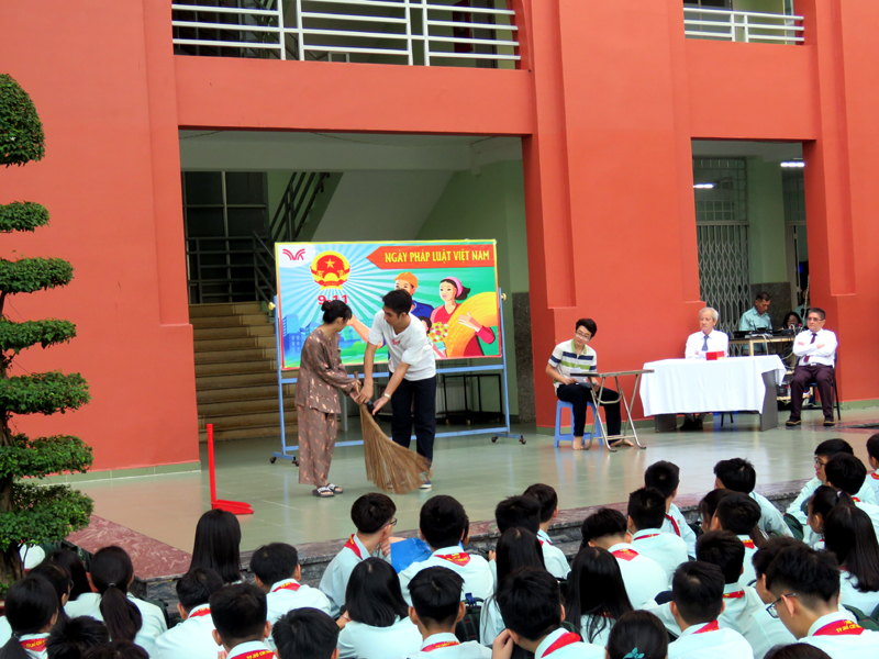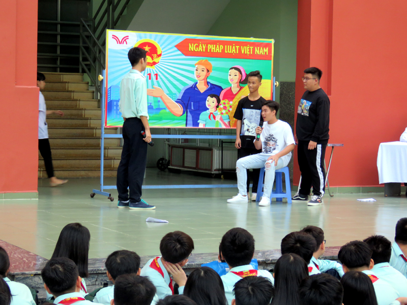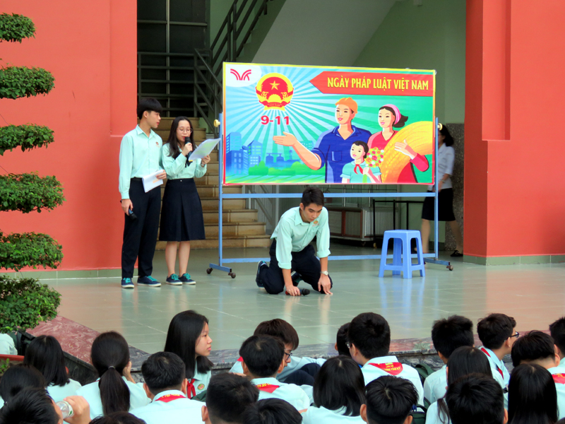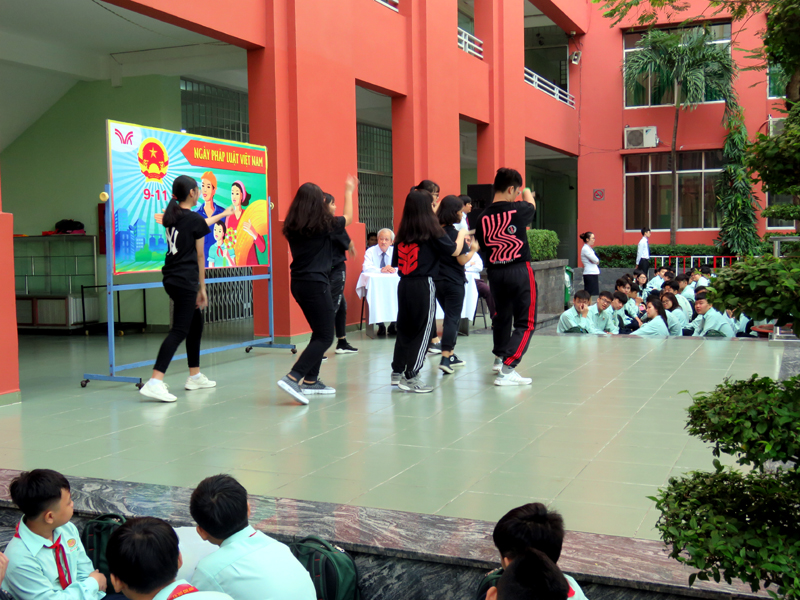Vào lúc 7g00 ngày thứ hai 04/11/2019, tại cơ sở TĐT, nhà trường đã tổ chức buổi sinh hoạt Ngoài giờ lên lớp với chủ đề “Ngày Pháp luật Việt Nam” do học sinh lớp 10A6 và 10A20 thực hiện. Nội dung của chương trình là tiết mục văn nghệ, kế tiếp là tiểu phẩm về “Ngày Pháp luật”. Cùng thời gian trên, tại cở sở BVT các em học sinh lớp 9A1 cũng thực hiện chuyên đề cùng với chủ đề này.