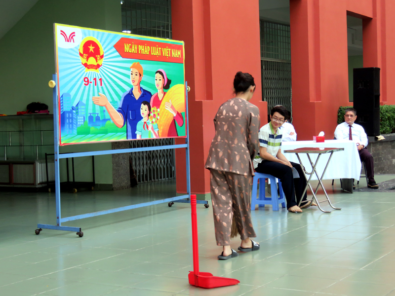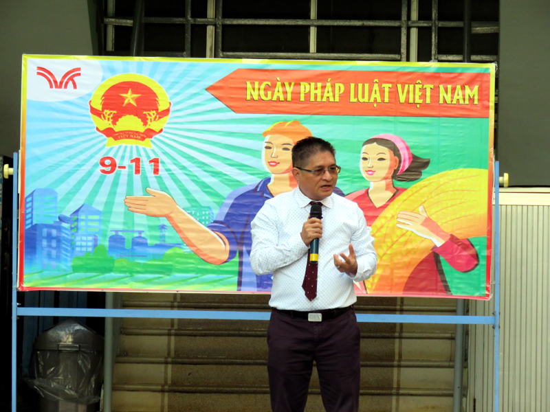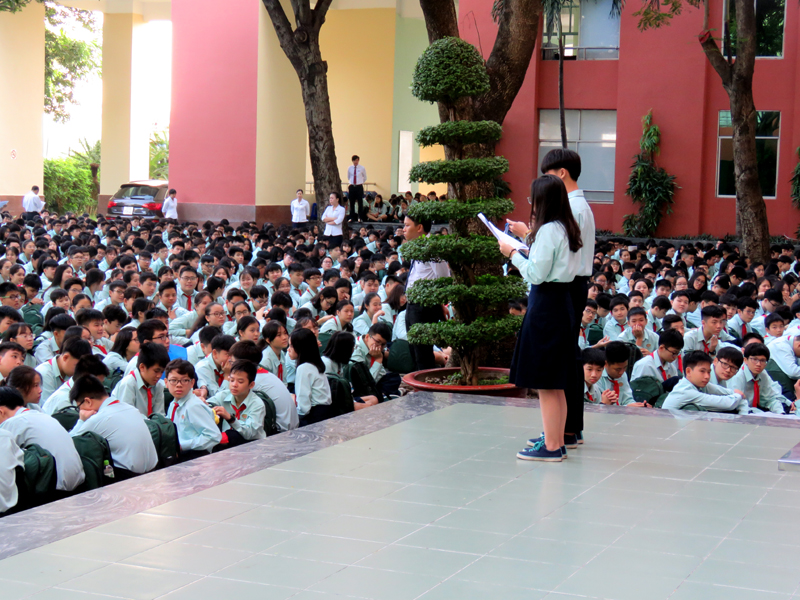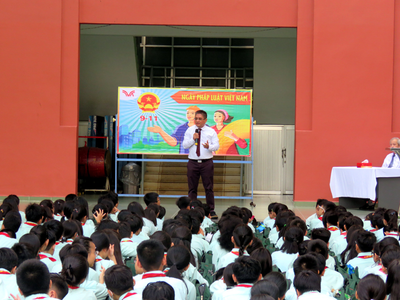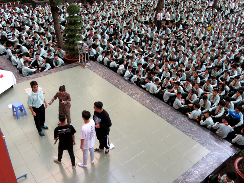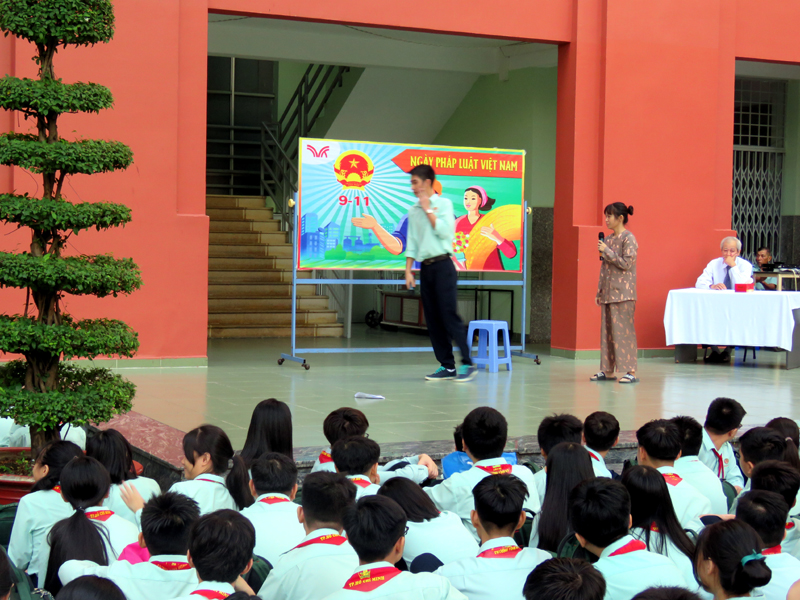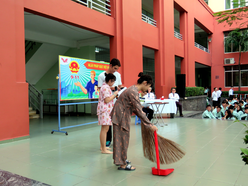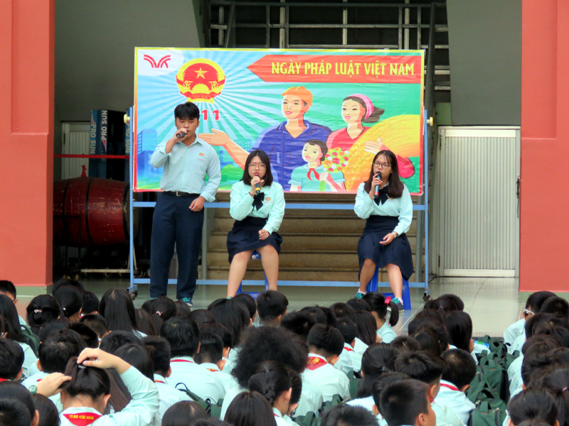 Vào lúc 7g00 ngày thứ hai 04/11/2019, tại cơ sở TĐT, nhà trường đã tổ chức buổi sinh hoạt Ngoài giờ lên lớp với chủ đề “Ngày Pháp luật Việt Nam” do học sinh lớp 10A6 và 10A20 thực hiện. Nội dung của chương trình là tiết mục văn nghệ, kế tiếp là tiểu phẩm về “Ngày Pháp luật”. Cùng thời gian trên, tại cở sở BVT các em học sinh lớp 9A1 cũng thực hiện chuyên đề cùng với chủ đề này.
