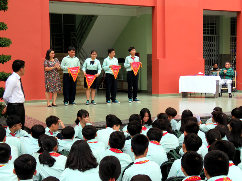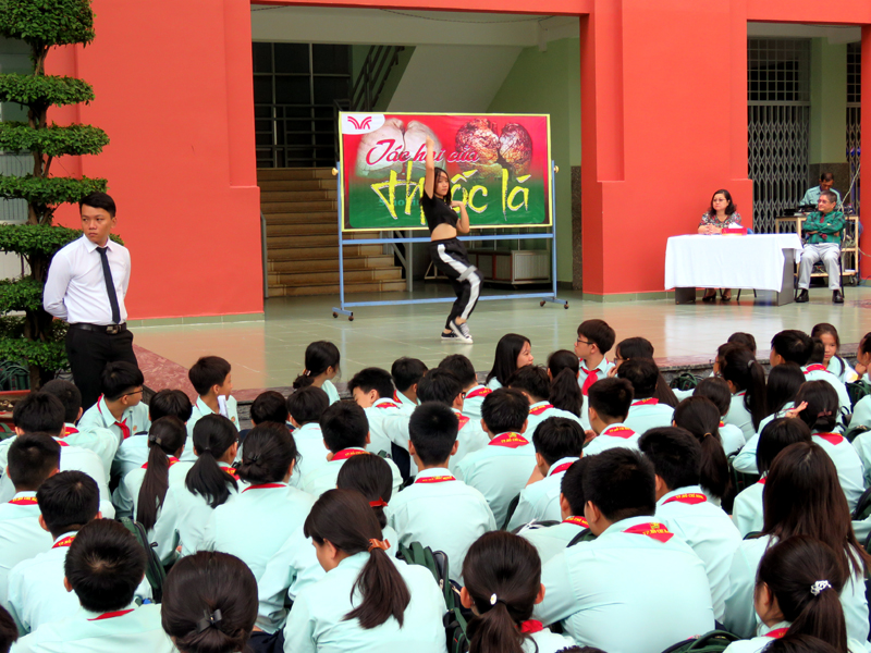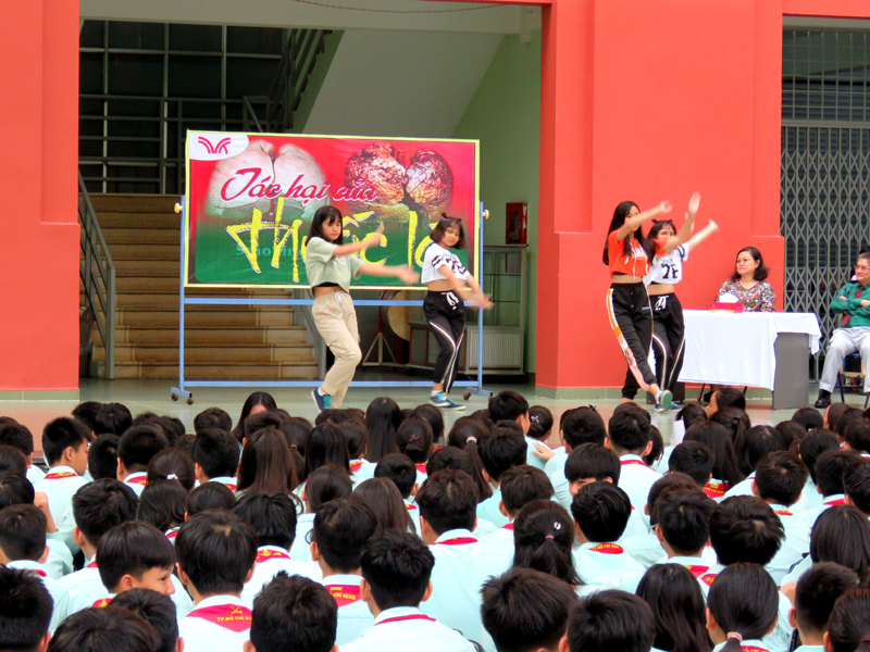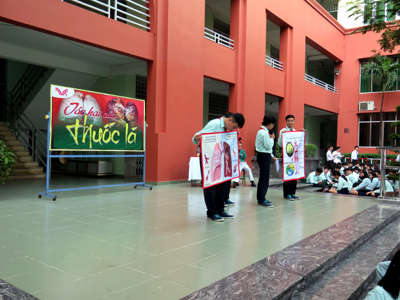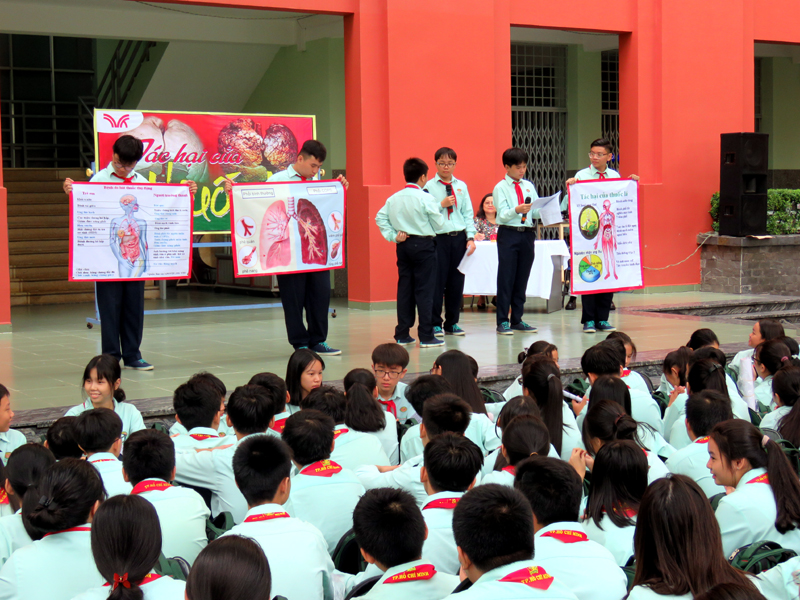 Buổi sinh hoạt là các tiết mục văn nghệ và thuyết trình về chủ đề “TÁC HẠI CỦA THUỐC LÁ" do học sinh lớp 9A2 và 9A10 thực hiện.