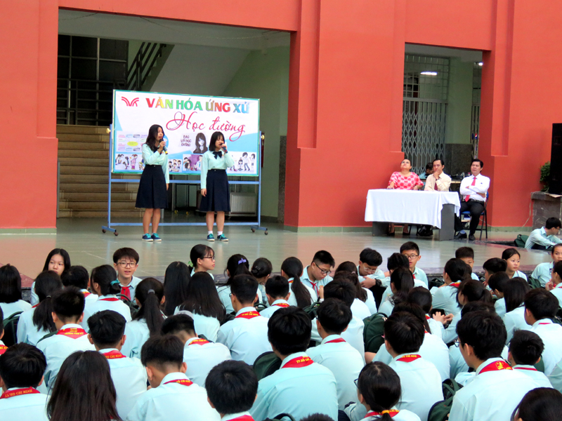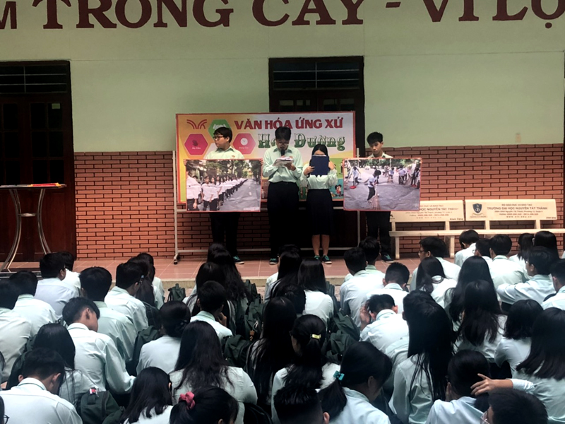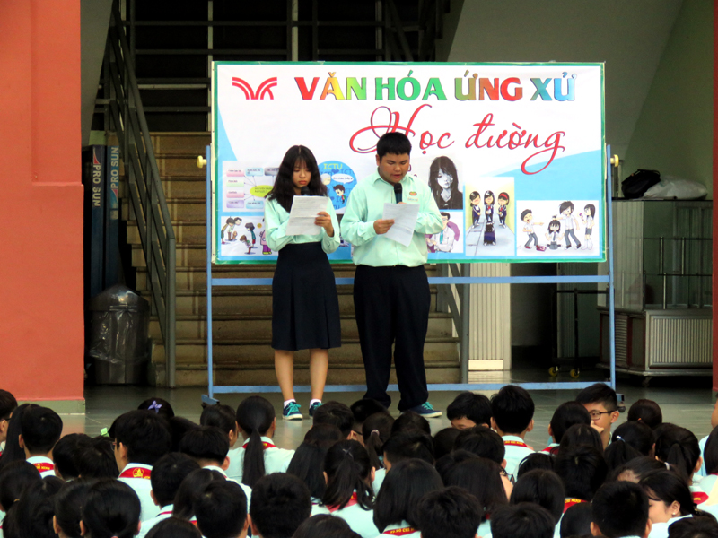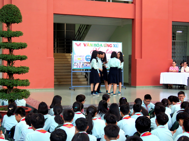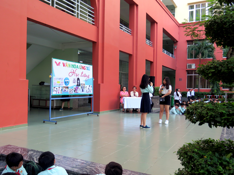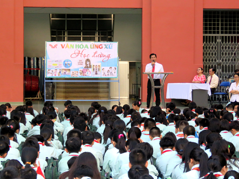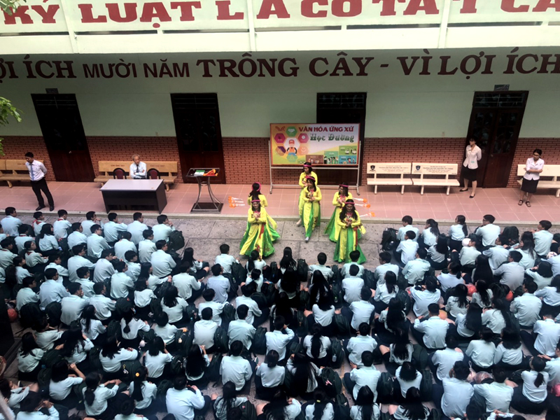 Vào lúc 7g00, thứ hai ngày 21/10/2019 tại 2 cơ sở. BLĐ nhà trường đã chỉ đạo thực hiện chương trình Ngoài giờ lên lớp với chủ đề “Văn hóa ứng xử học đường”.