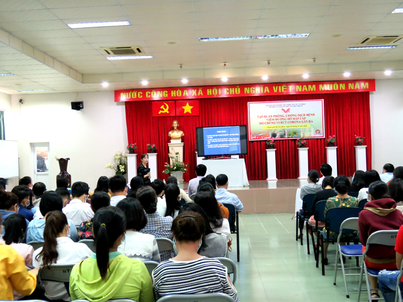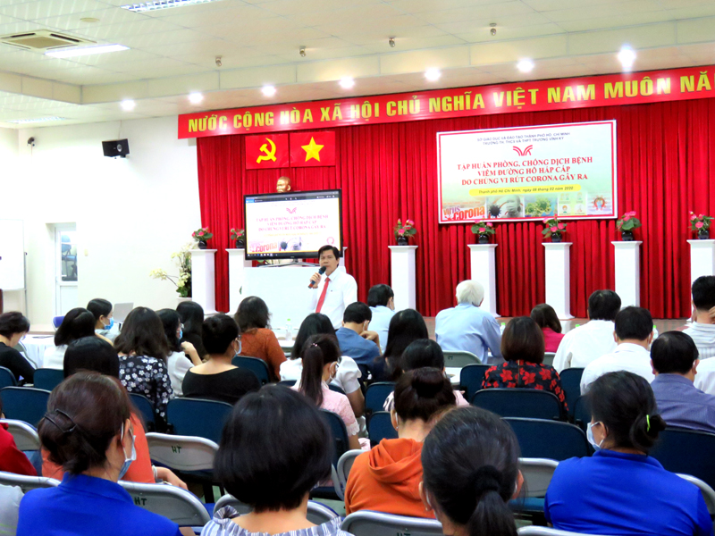 Vào lúc 8g00, thứ bảy, ngày 08/02/2020. Ban Lãnh đạo nhà trường phối hợp với trạm y tế phường 5, quận 11 tổ chức buổi tập huấn phòng chống dịch viêm đường hô hấp cấp do chủng mới của vi rút Corona gây ra cho gần 300 cán bộ, giáo viên, nhân viên toàn trường.