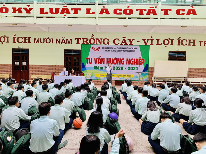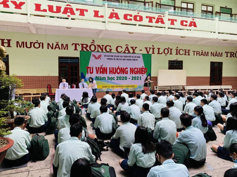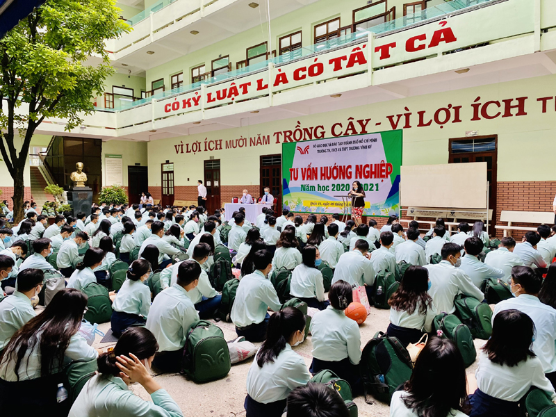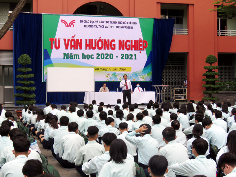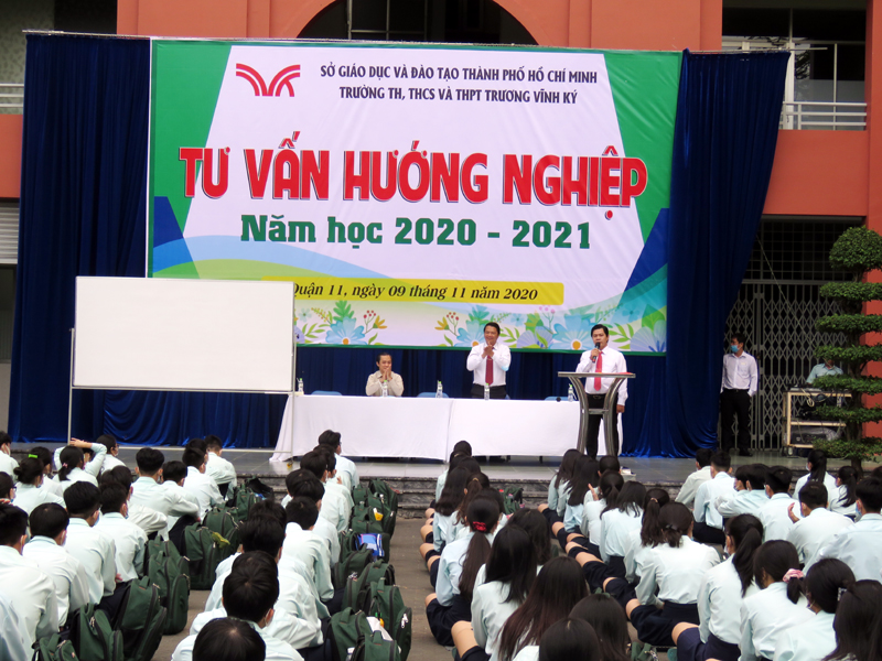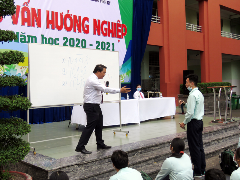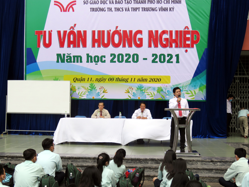 Sau phần phát biểu khai mạc của thầy Phan Văn Thanh – Hiệu trưởng trường Trương Vĩnh Ký là phần tư vấn về những vấn đề hướng nghiệp chọn ngành chọn nghề. Các em học sinh được nghe những vấn đề liên quan đến việc chọn ngành – nghề và định hướng vào các trường Đại học và Cao Đẳng năm 2021.