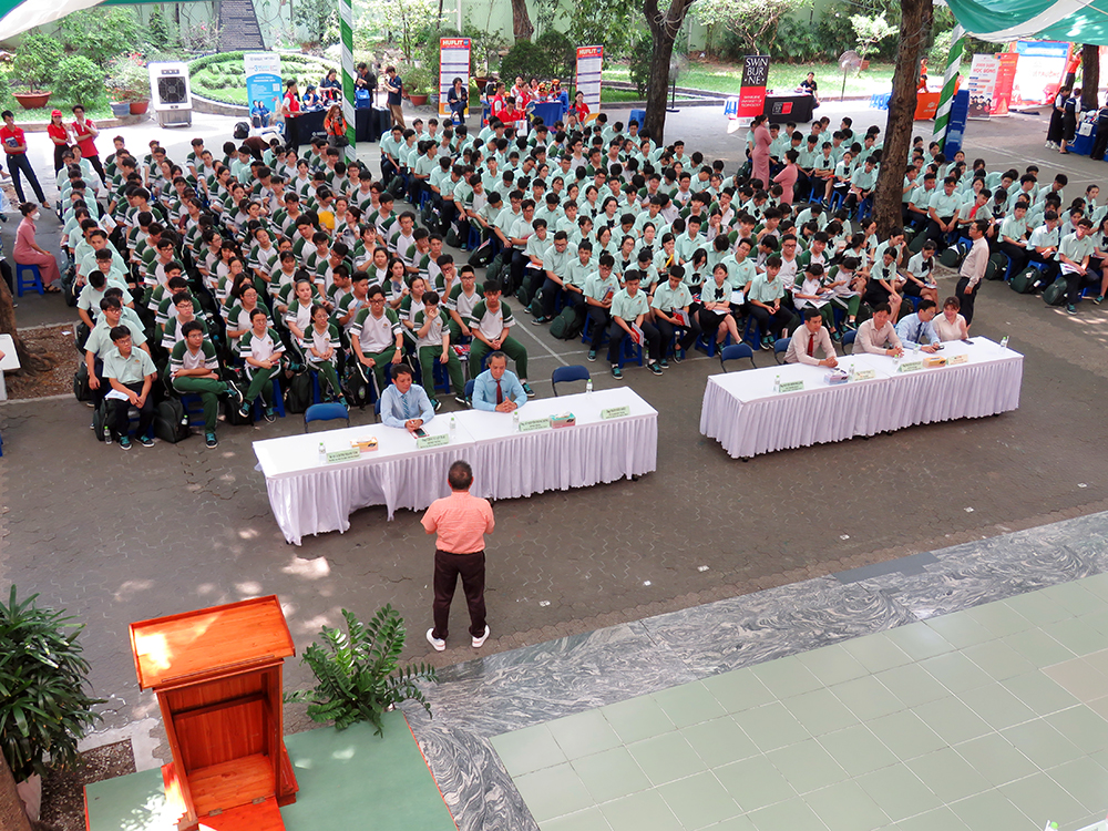 Mở đầu chương trình là phát biểu mở đầu của thầy Trần Văn Hiếu – Chủ tịch Hội đồng Trường trường TH, THCS và THPT Trương Vĩnh Ký. Tiếp theo là phần cung cấp thông tin về thị trường lao động và sau đó là nội dung các trường Đại học – Cao đẳng giới thiệu chung về trường và trả lời câu hỏi của các em học sinh.