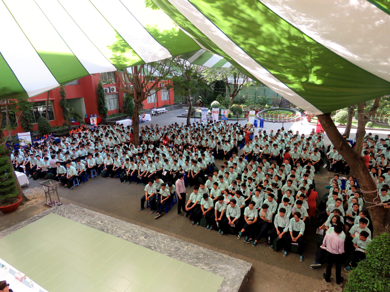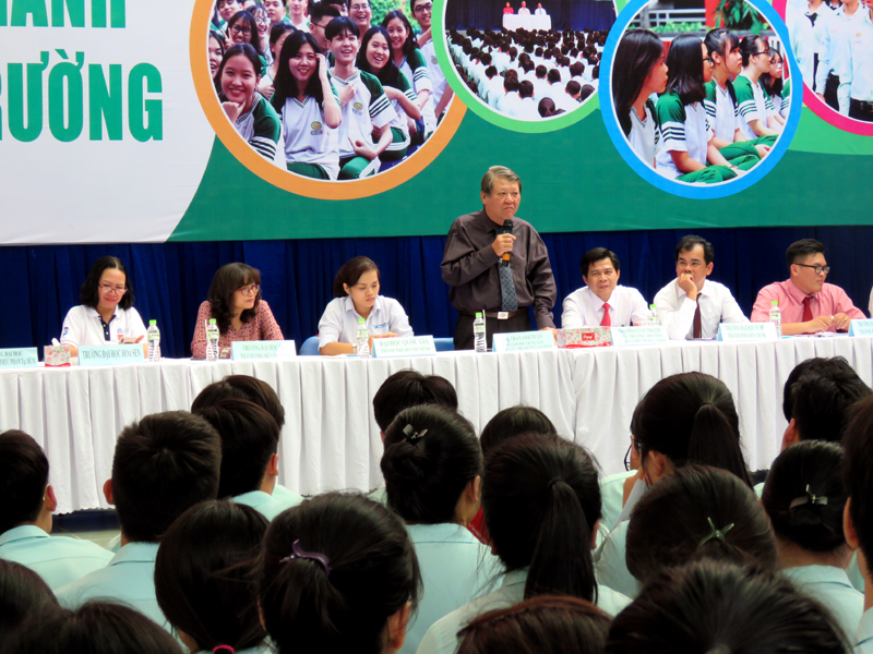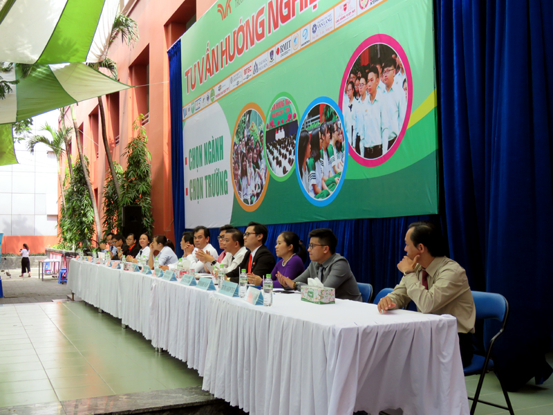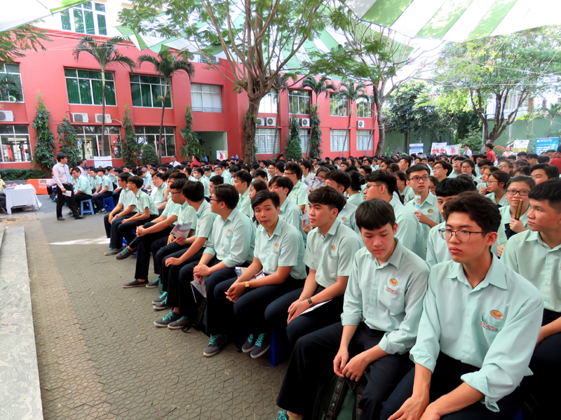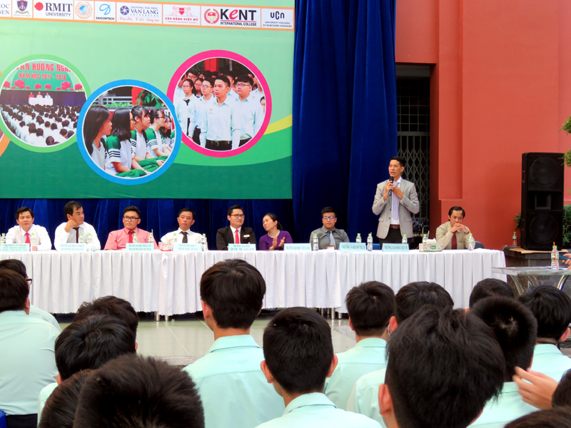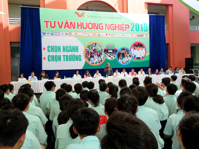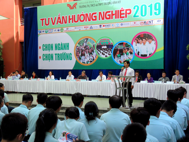 Sau phần phát biểu khai mạc của thầy Phan Văn Thanh – Hiệu trưởng trường Trương Vĩnh Ký là phần tư vấn chung về những vấn đề hướng nghiệp chọn ngành chọn nghề 2019. Các em học sinh được nghe những vấn đề liên quan đến việc chọn ngành – nghề thi vào các trường Đại học và Cao Đẳng năm 2019.