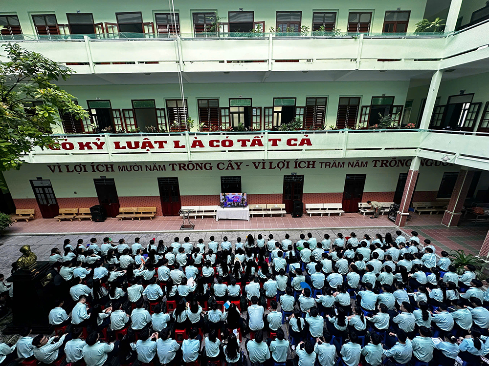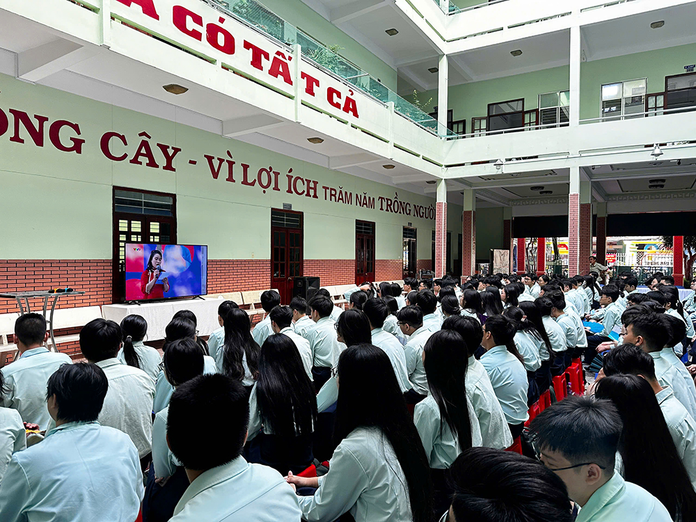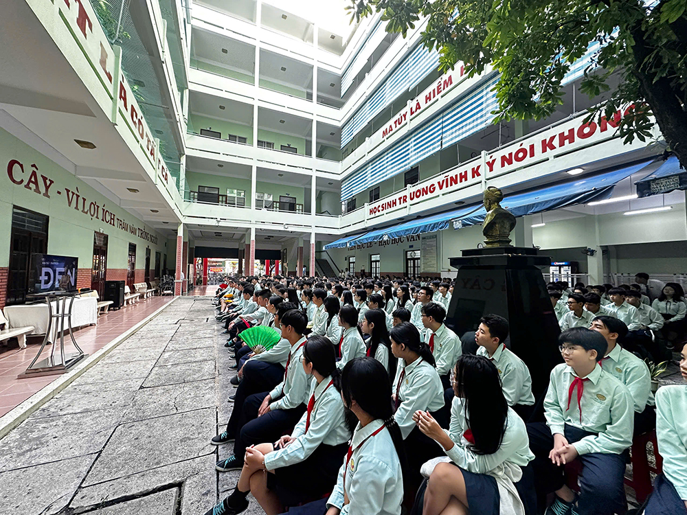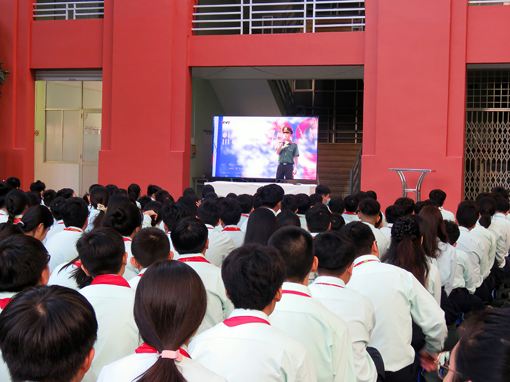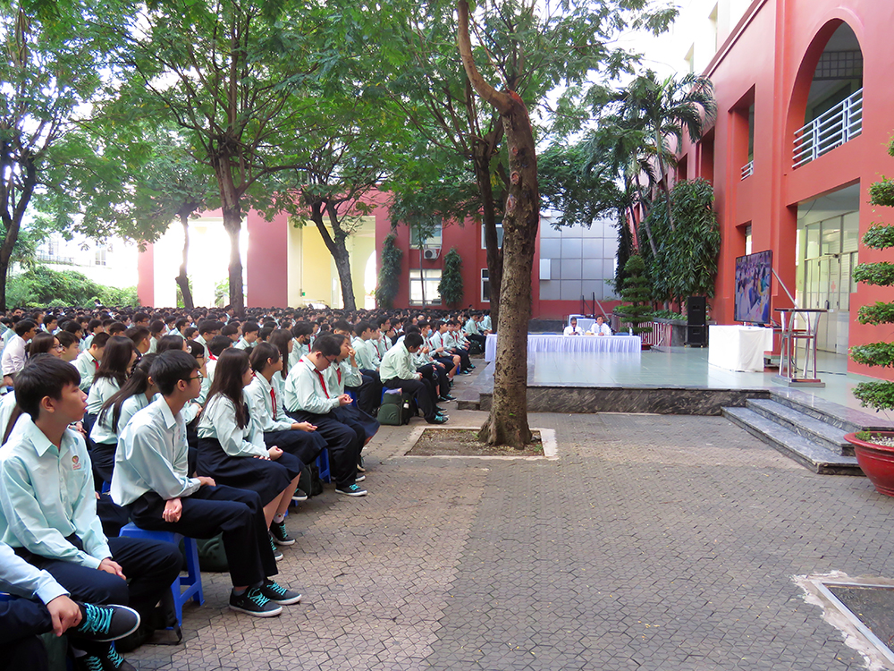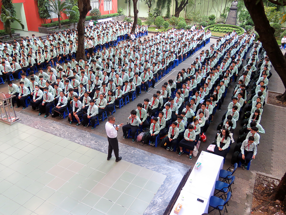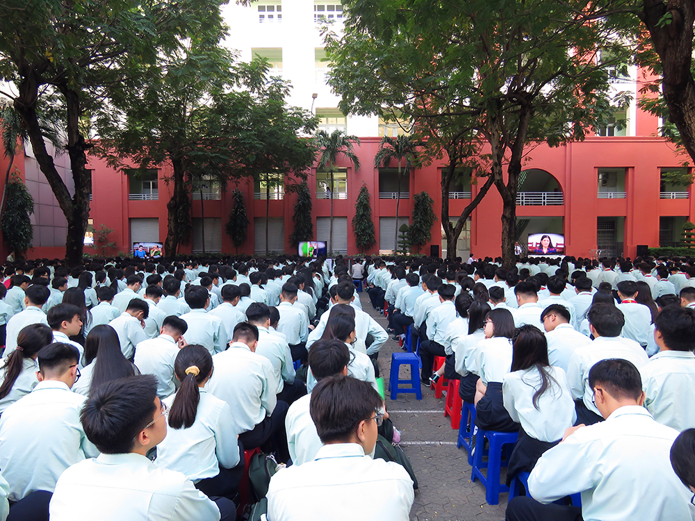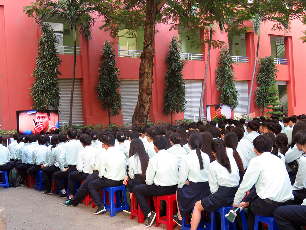 Tham dự buổi tuyên truyền trực tuyến có đại diện Ban Lãnh đạo nhà trường, đại diện quý Cha mẹ học sinh, giáo viên chủ nhiệm và toàn thể học sinh từ khối 6 đến khối 12 ở hai cơ sở Bành Văn Trân và Trịnh Đình Trọng.