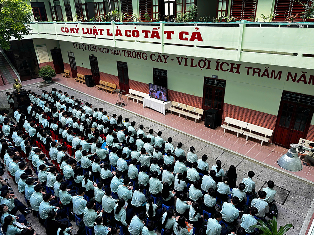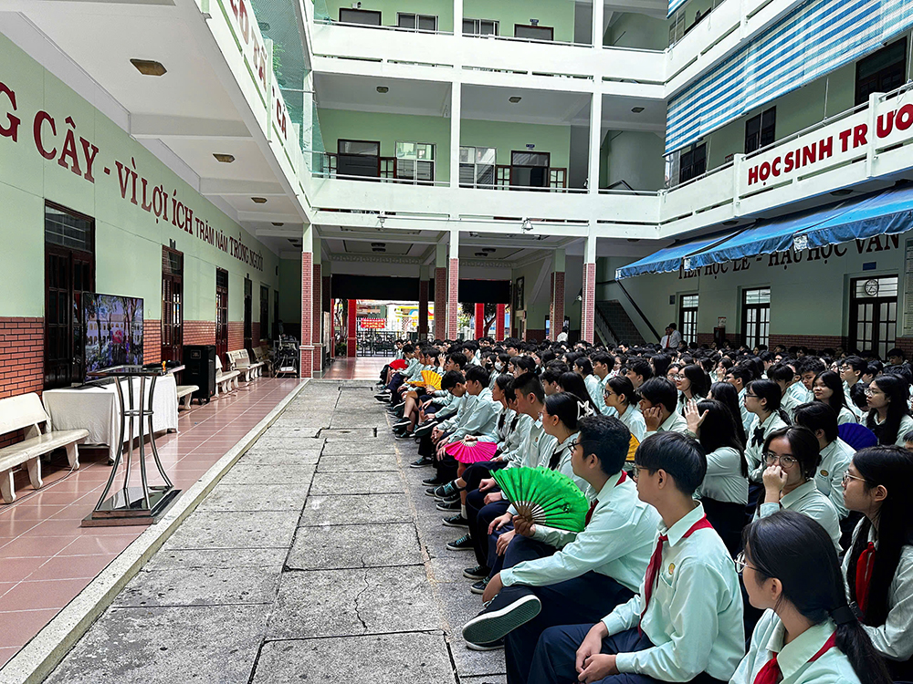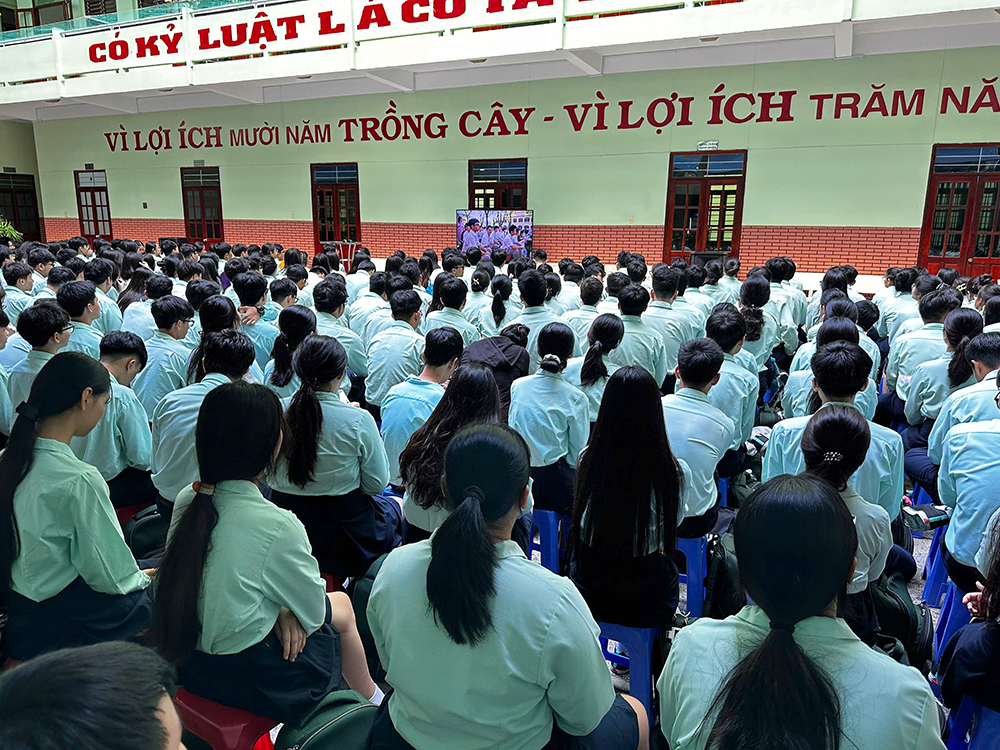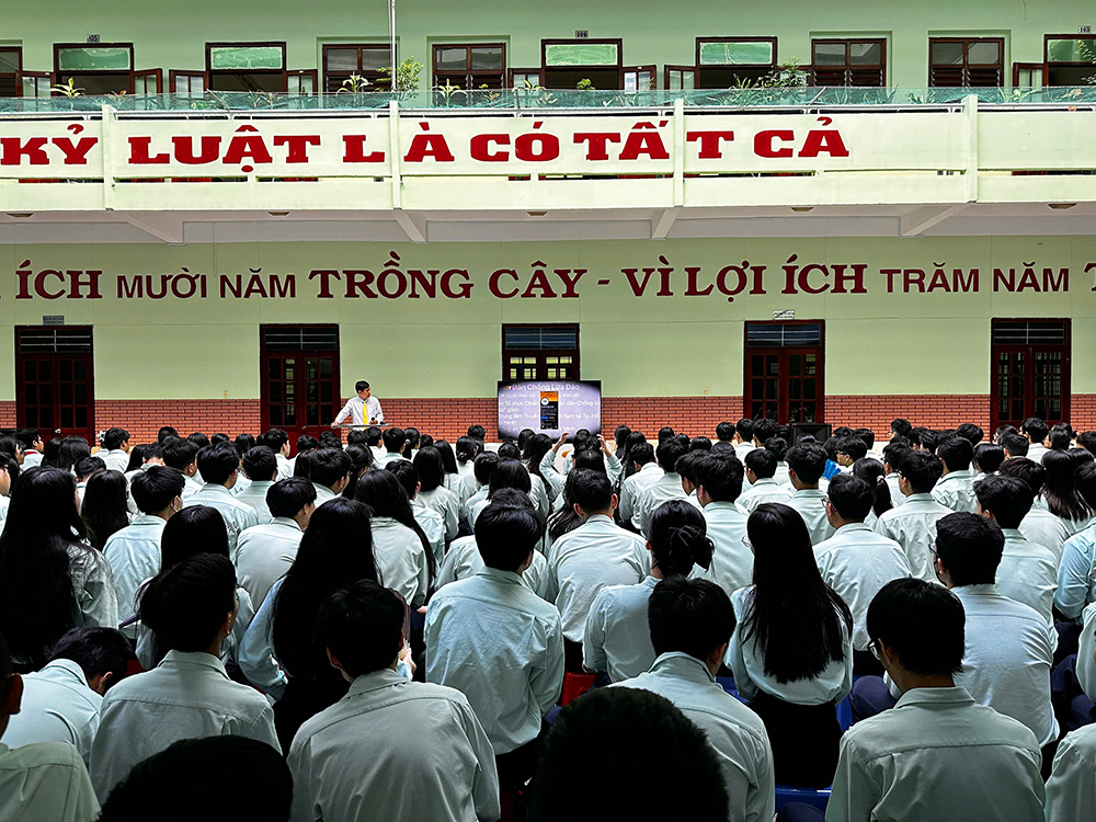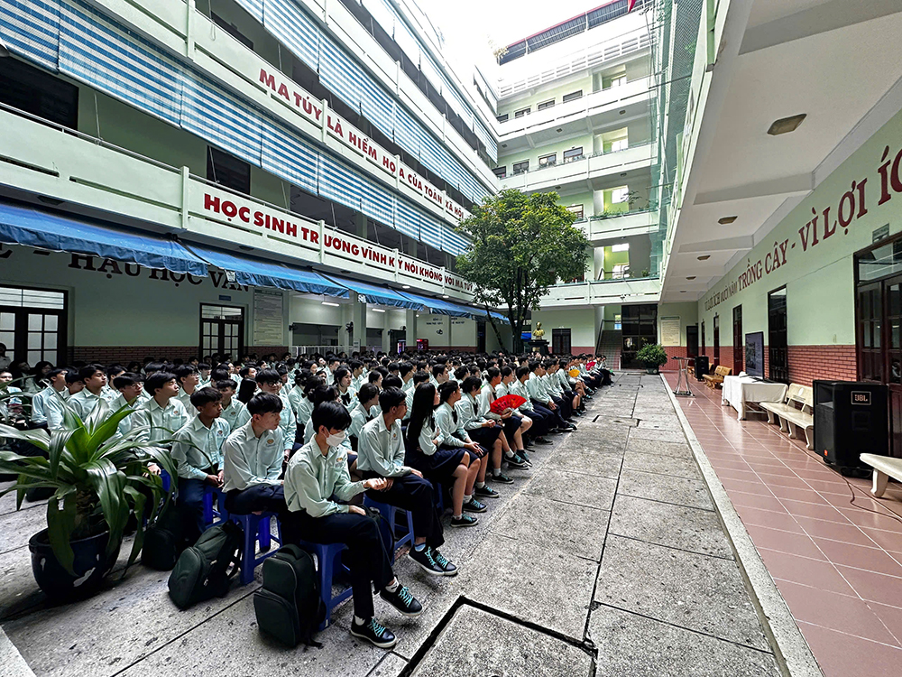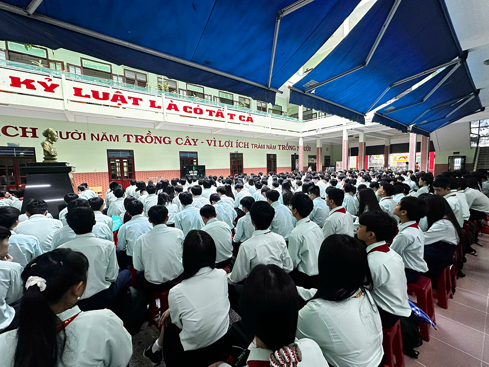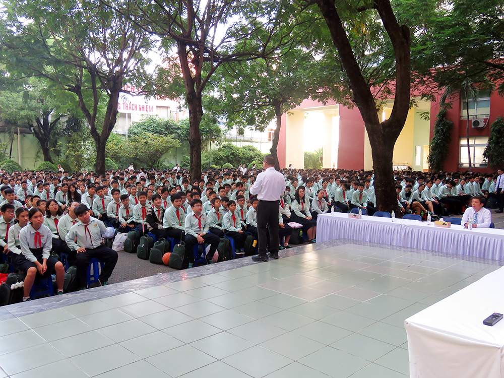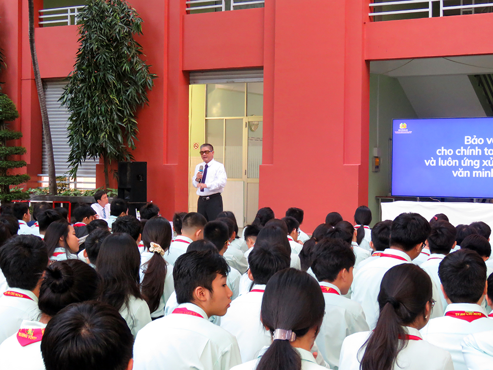 Tham dự buổi tuyên truyền trực tuyến có đại diện Ban Lãnh đạo nhà trường, đại diện quý Cha mẹ học sinh, giáo viên chủ nhiệm và toàn thể học sinh từ khối 6 đến khối 12 ở hai cơ sở Bành Văn Trân và Trịnh Đình Trọng.